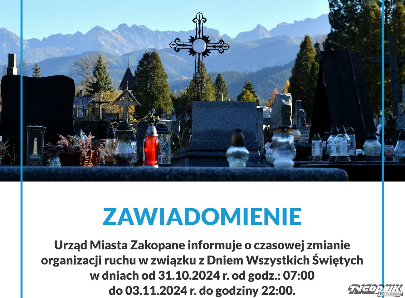 Urząd Miasta Zakopane informuje o czasowej zmianie organizacji ruchu w związku z Dniem Wszystkich Świętych od godz. 7 rano 31 października 3 listopada do godziny 22:00.
