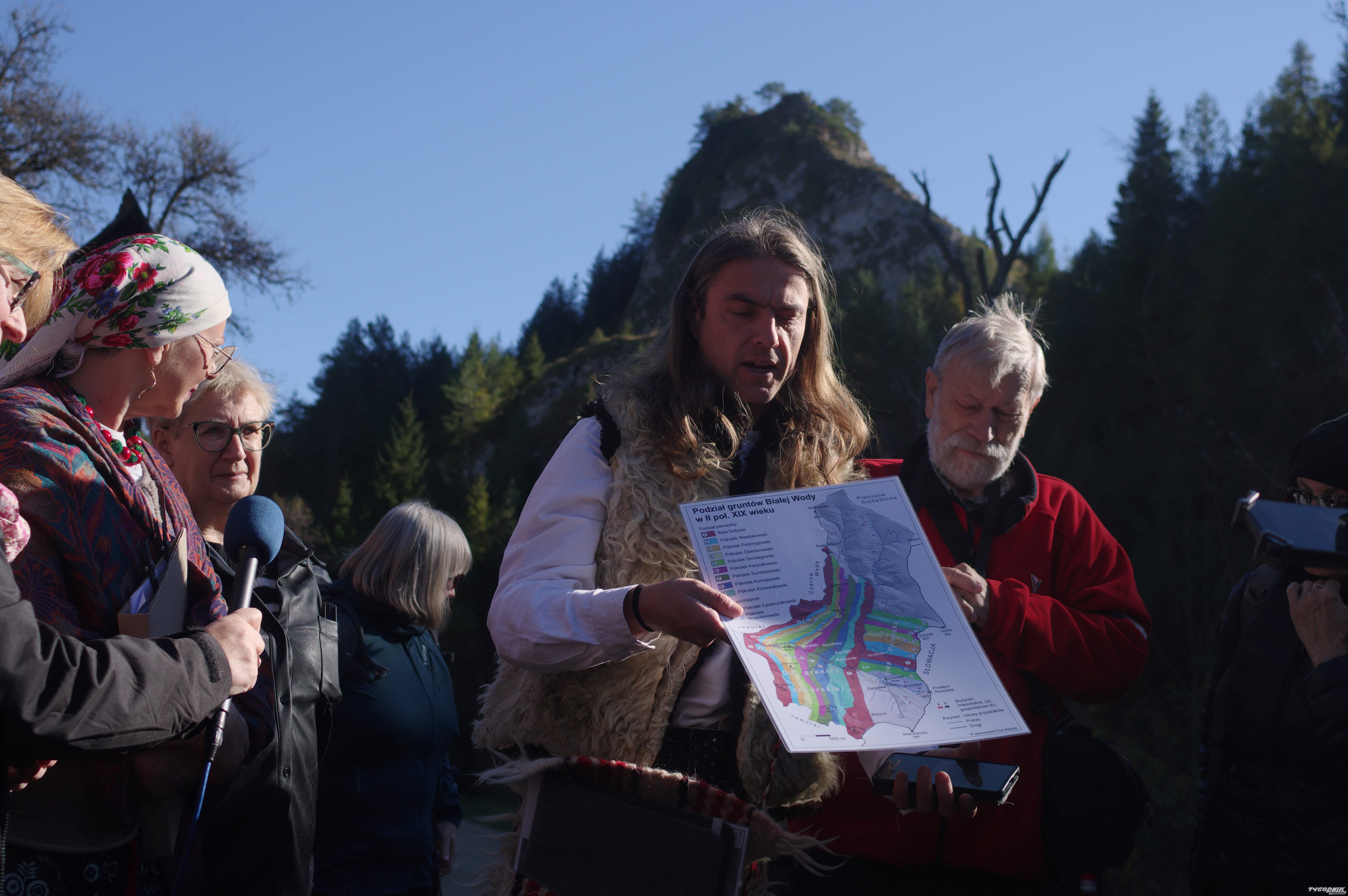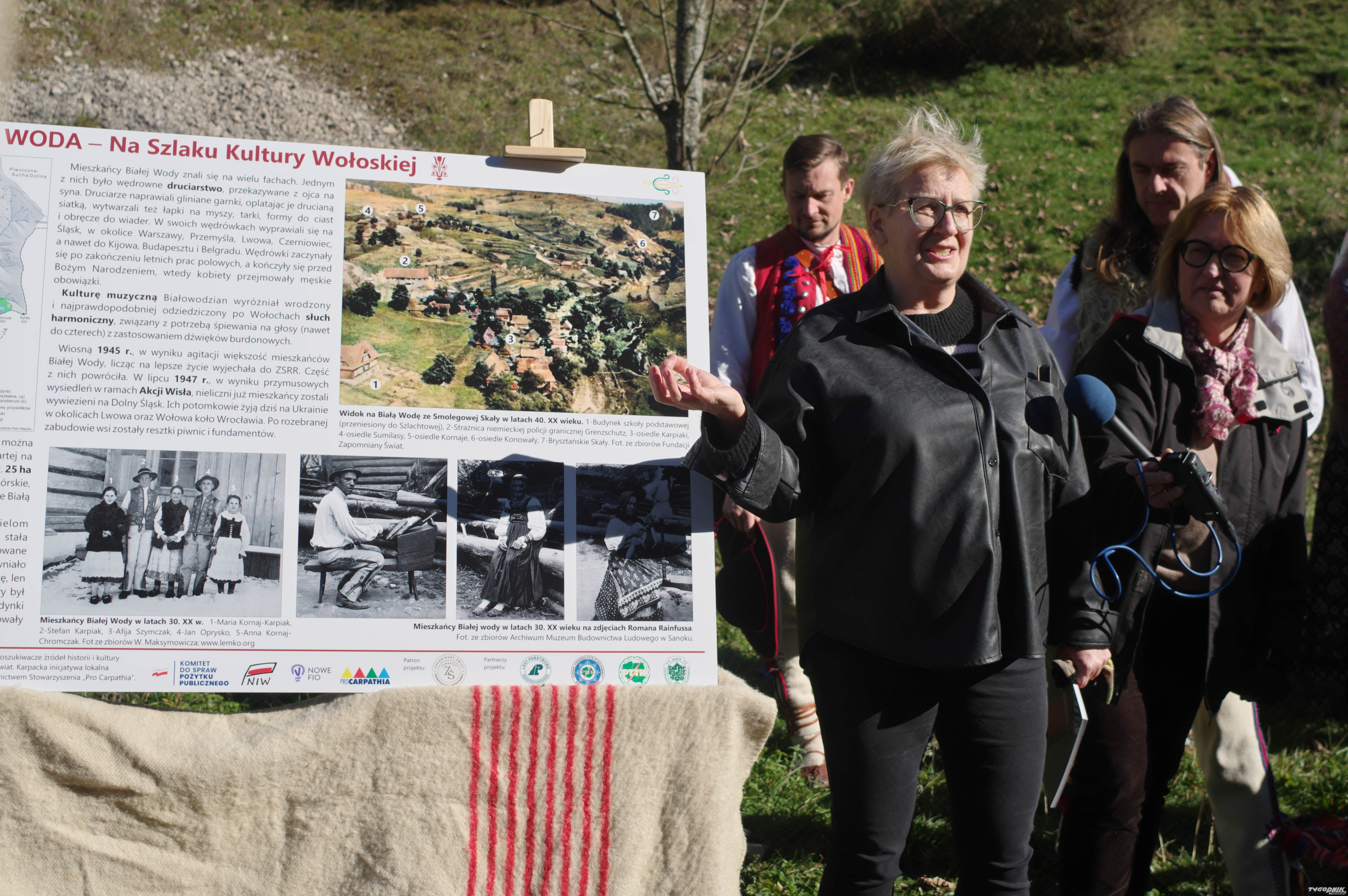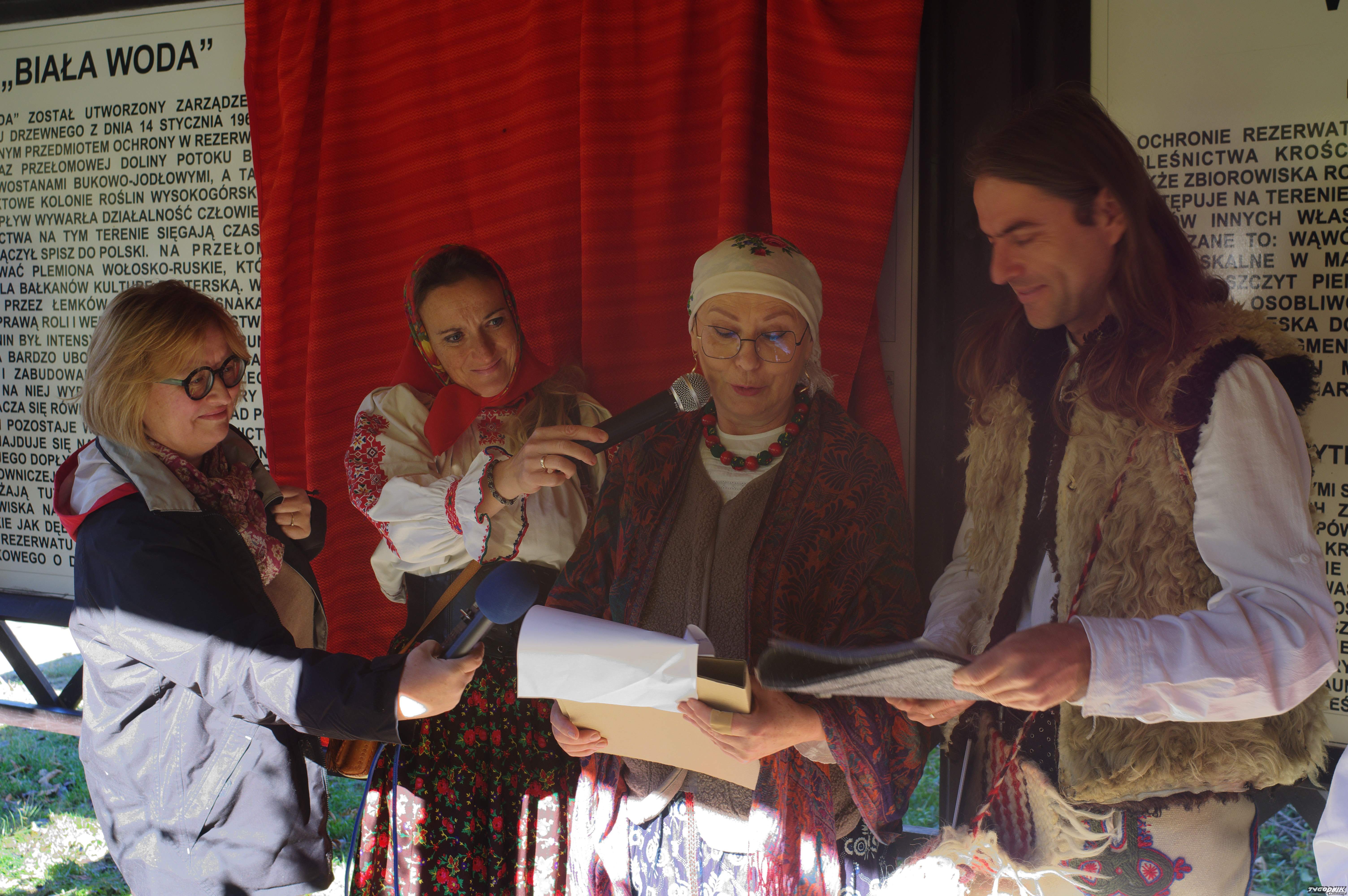 Po zakończeniu oficjalnej części goście wyruszyli na historyczno-kulturowy spacer przez dolinę Białej Wody, którą poprowadził Piotr Kłapyta. Kulturę Białej Wody przywołały żywe obrazy towarzyszące odsłonie drugiej tablicy, która w przyszłości znajdzie się w środku doliny na stałe. Była to scenka przędzenia na kądzieli oraz śpiewy rusińskie z tego regionu w prezentacji etnomuzykolog Izabeli de Lehenstein Werndl. Była to okazja do zaprezentowania strojów z Osturni po słowackiej stronie - istniejącej do dziś - najdalej na Zachód w Europie wysuniętej wsi rusińsko-wołoskiej. O strojach dawnych mieszkańców zgromadzonych w Muzeum Pienińskim im. J. Szalaya w Szlachtowej opowiadała dyrektorka tej instytucji - Barabara Węglarz.
