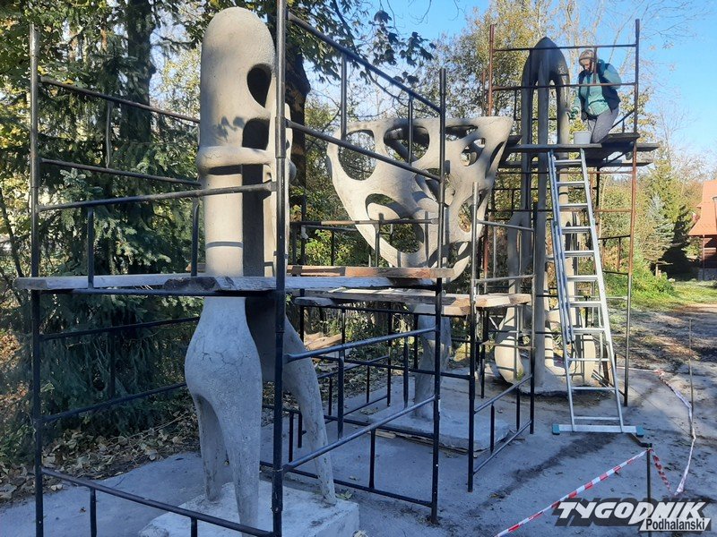 - To jest beton z lat 80. Rzeźby były robione na konstrukcji żebrowej, stalowej z narzutu i mimo że z cementem było wtedy krucho, jak się przekonaliśmy, wykonane są one z wysokiej klasy cementu i są bardzo twarde i odporne. Nie używamy absolutnie wody. O tej porze roku byłoby to zabójstwo dla tych rzeźb - zapewnia wykonawca.
