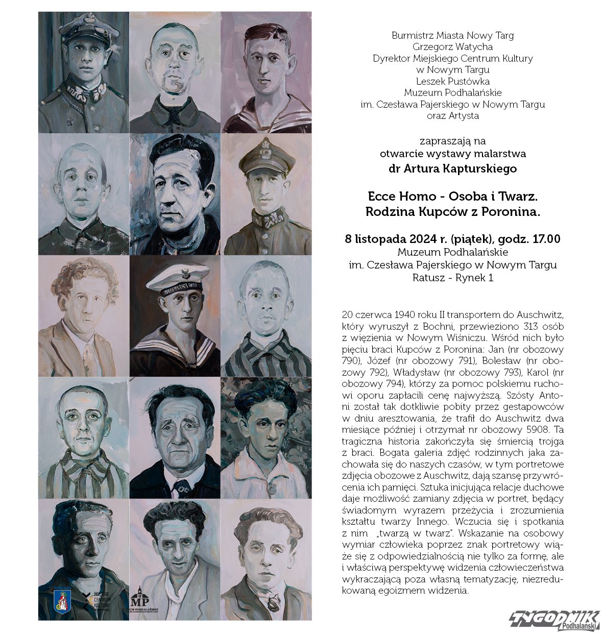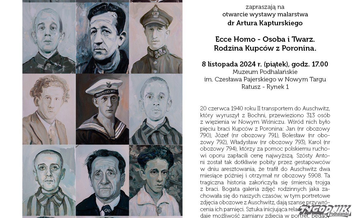 "20 czerwca 1940 roku II transportem do Auschwitz, który wyruszył z Bochni, przewieziono 313 osób z więzienia w Nowym Wiśniczu. Wśród nich było pięciu braci Kupców z Poronina: Jan (nr obozowy 790), Józef (nr obozowy 791), Bolesław (nr obozowy 792), Władysław (nr obozowy 793), Karol (nr obozowy 794), którzy za pomoc polskiemu ruchowi oporu zapłacili cenę najwyższą. Szósty Antoni został tak dotkliwie pobity przez gestapowców w dniu aresztowania, że trafił do Auschwitz dwa miesiące później i otrzymał nr obozowy 5908. Ta tragiczna historia zakończyła się śmiercią trojga z braci. Bogata galeria zdjęć rodzinnych jaka zachowała się do naszych czasów, w tym portretowe zdjęcia obozowe z Auschwitz, dają szansę przywrócenia ich pamięci" - czytamy w materiałach przysłanych przez organizatora wystawy w Ratuszu.