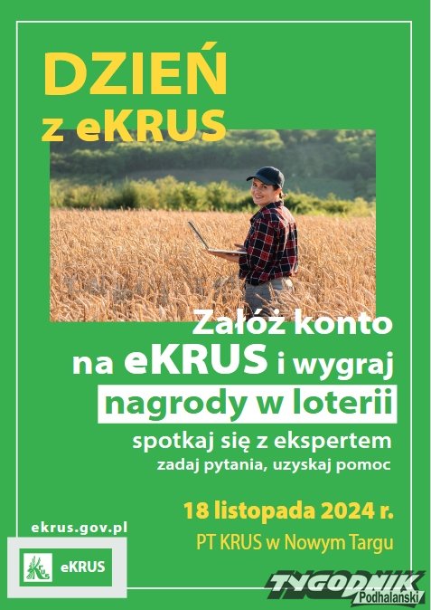 W ramach ogólnopolskiej akcji „Dzień z eKRUS” w poniedziałek 18 listopada także w Nowym Targu odbędzie się spotkanie z ekspertem KRUS dla rolników, domowników i członków ich rodzin, podczas którego promowany będzie portal e-KRUS.