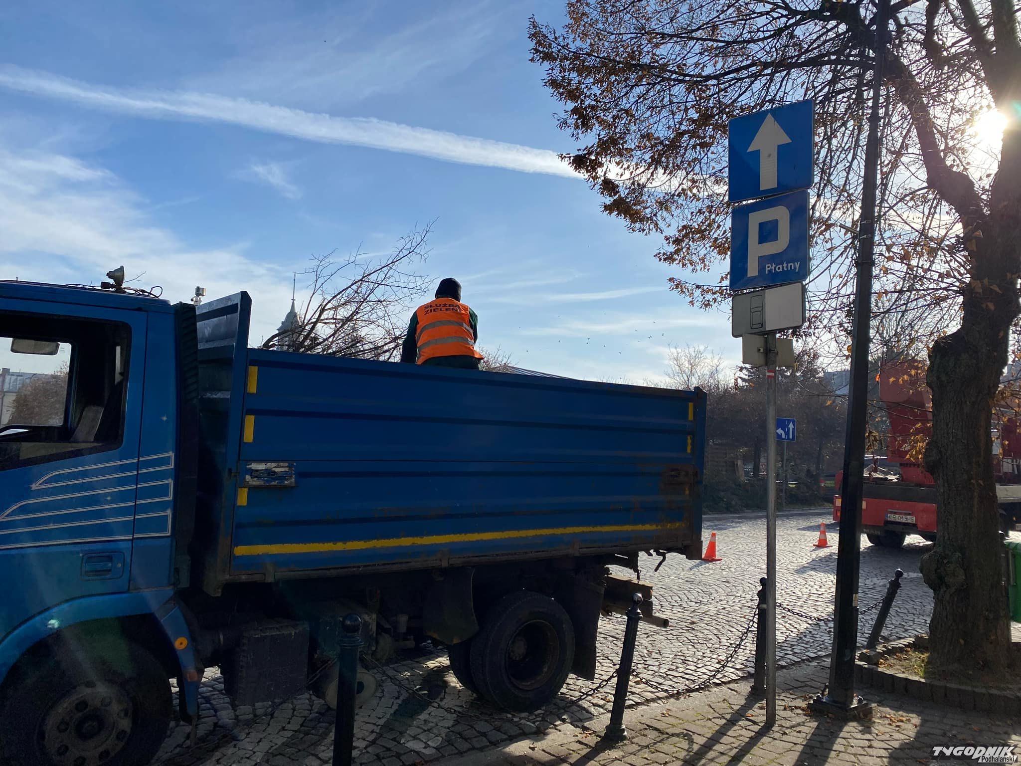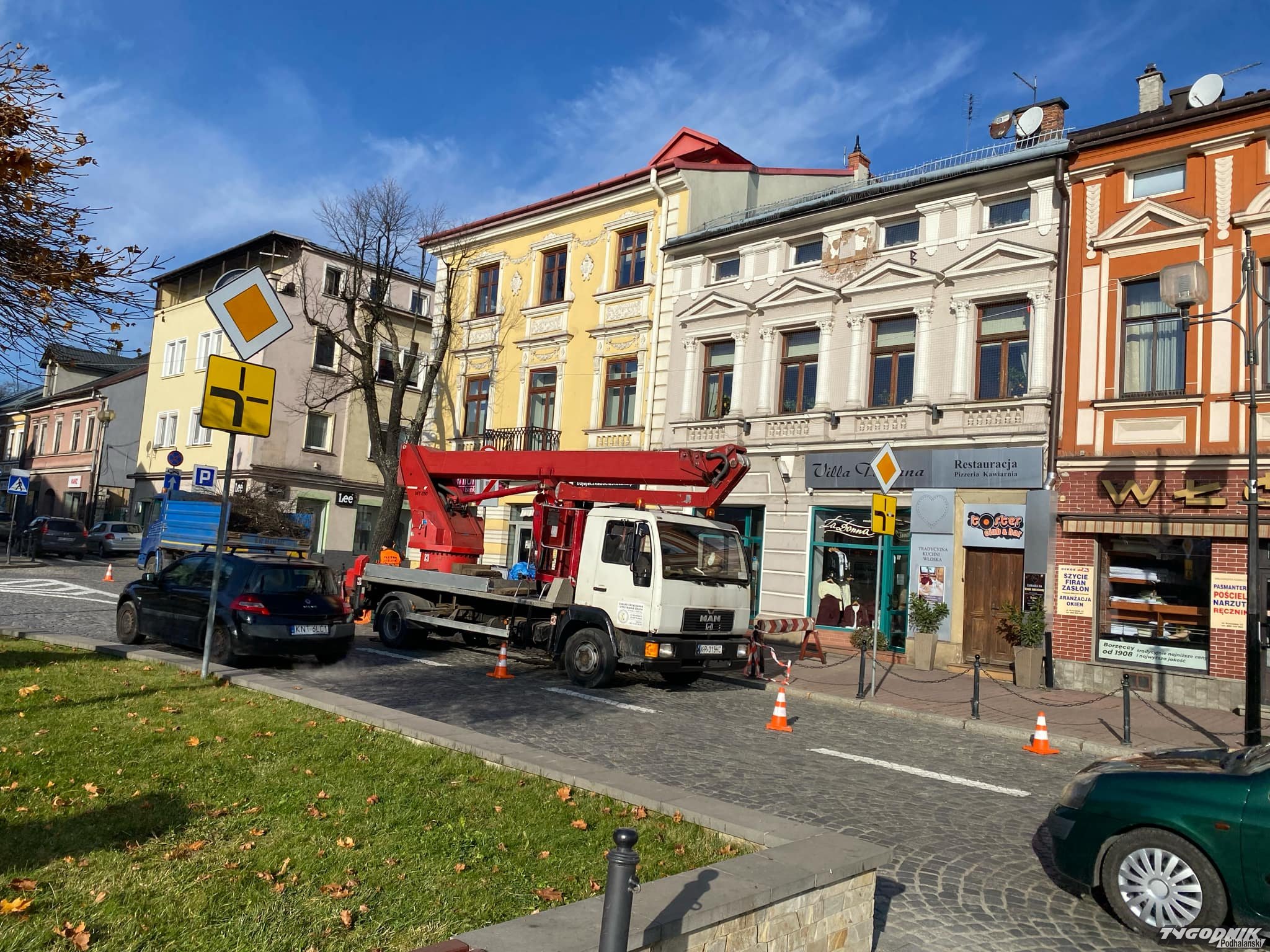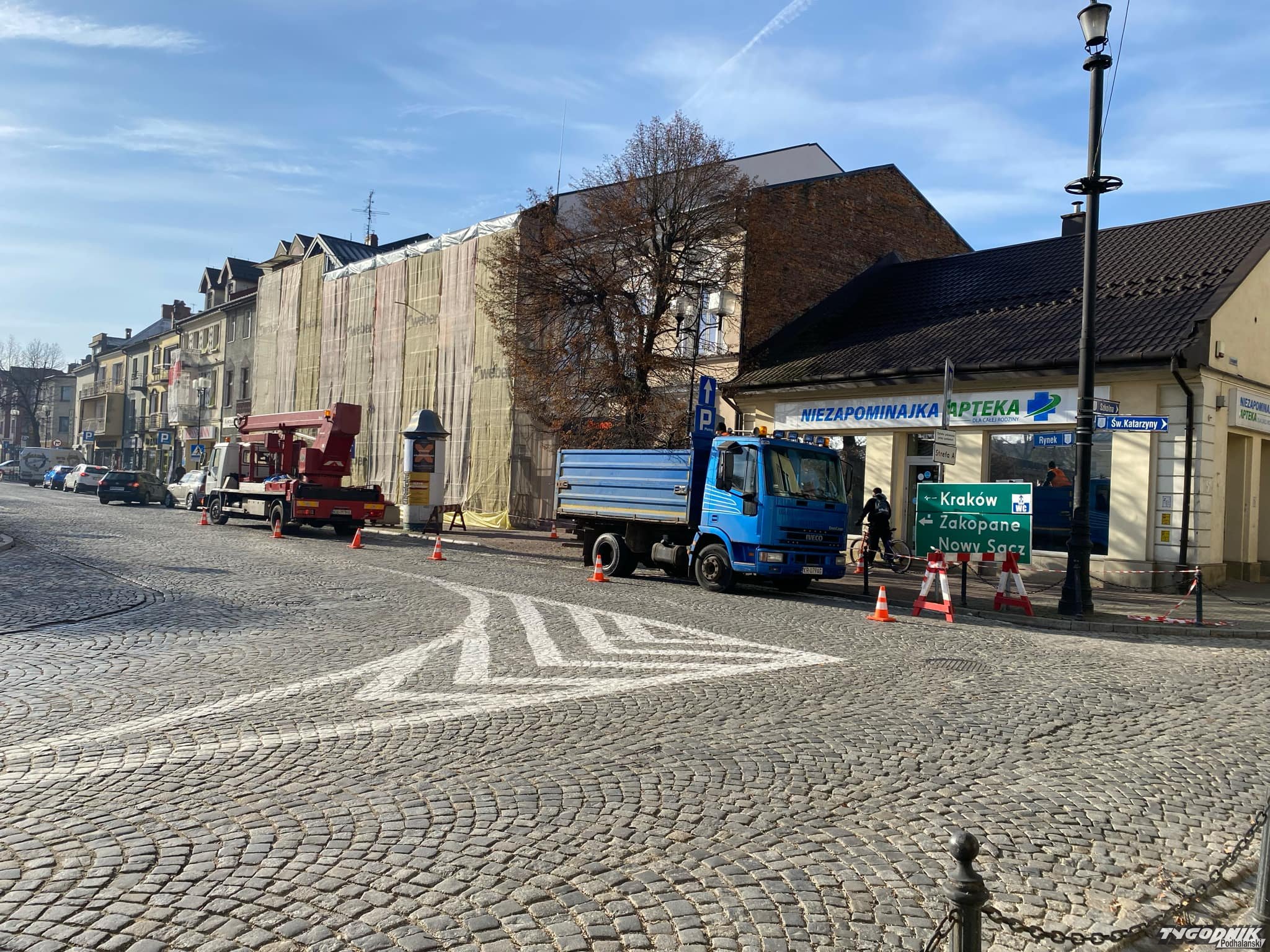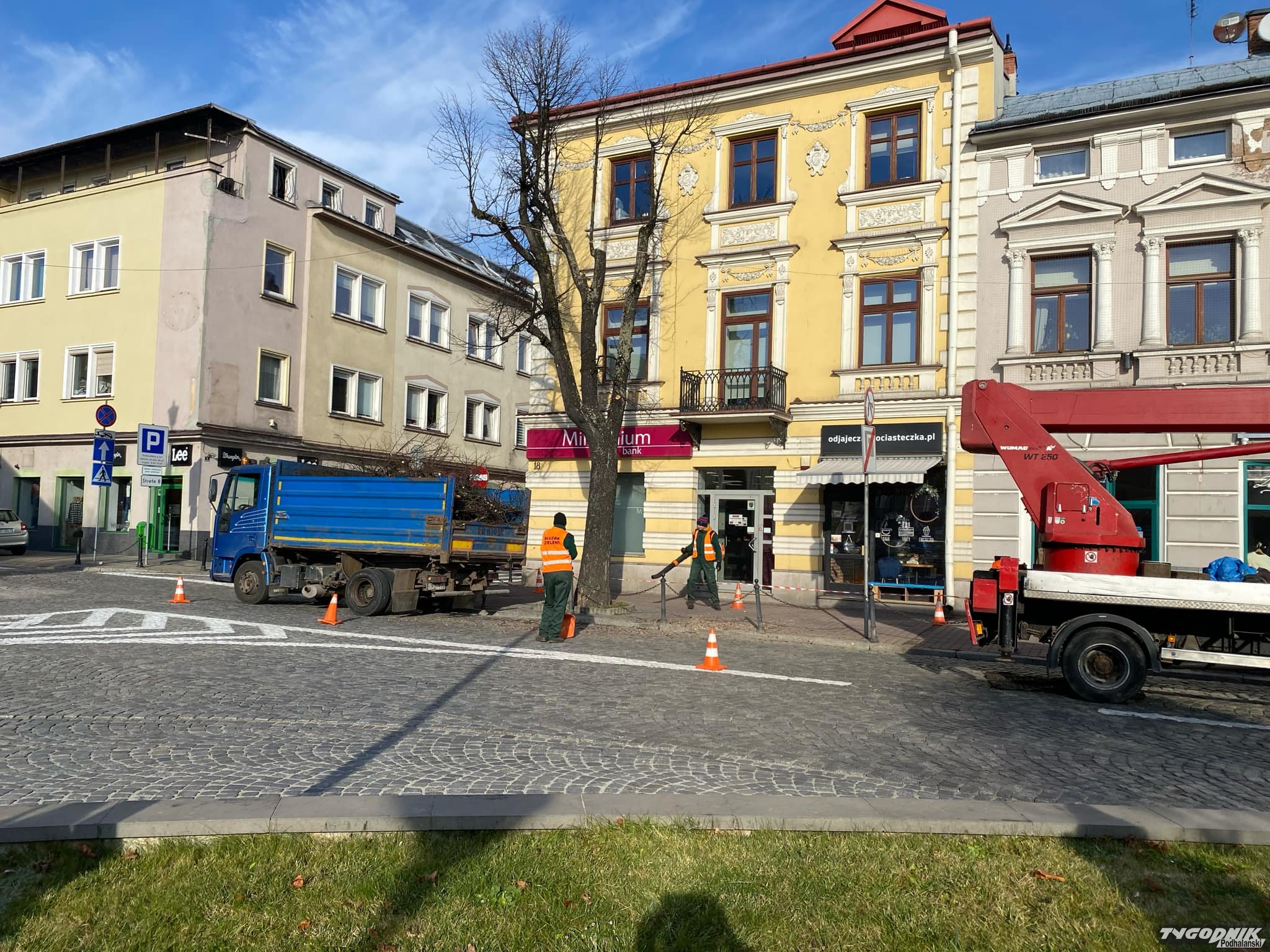 Od rana trwa akcja przycinania gałęzi na Rynku w Nowym Targu.