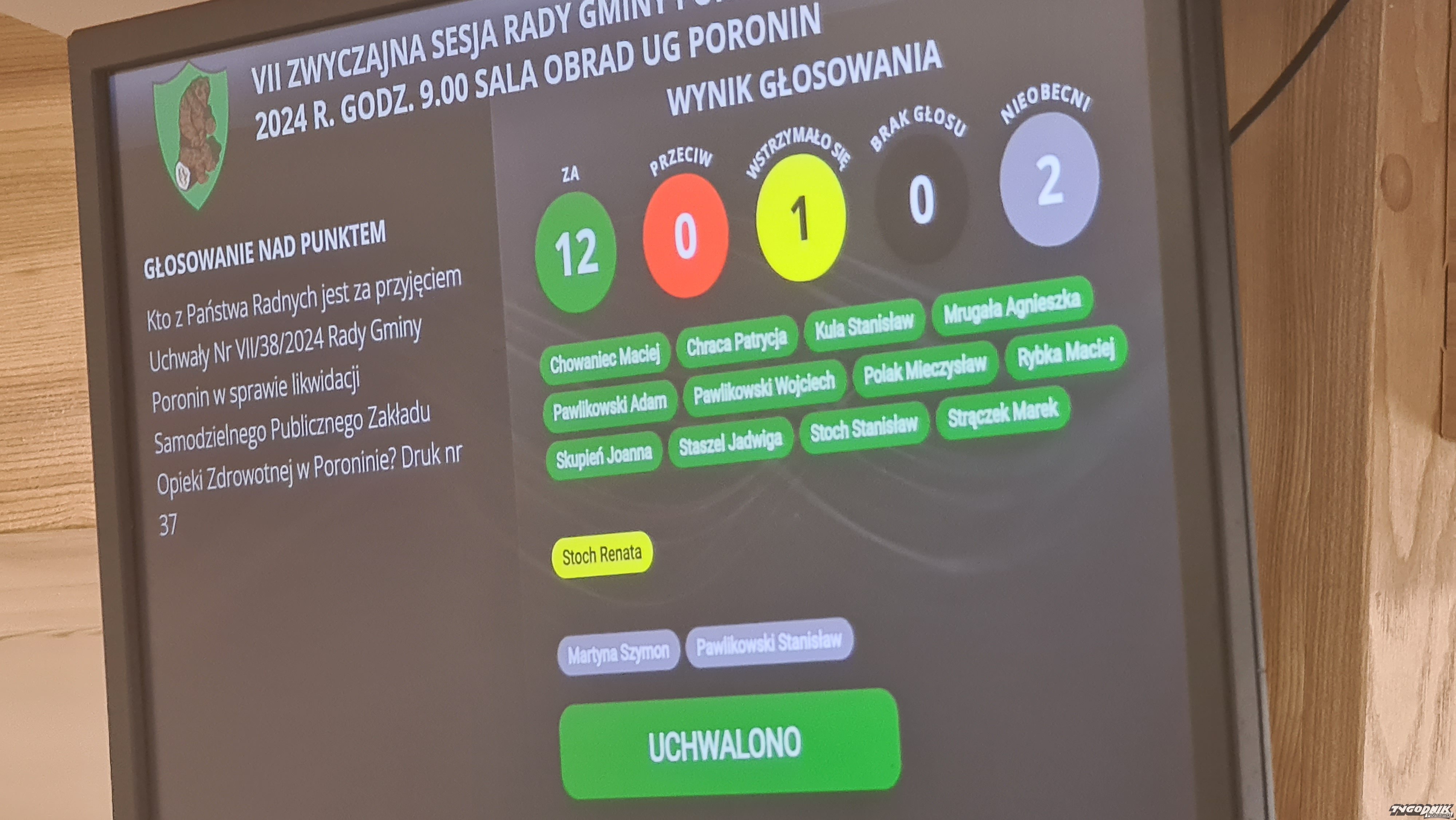 W głosowaniu radni podjęli decyzję o likwidacji SP ZOZ. 12 radnych było za likwidacją jeden wstrzymał się od głosu.