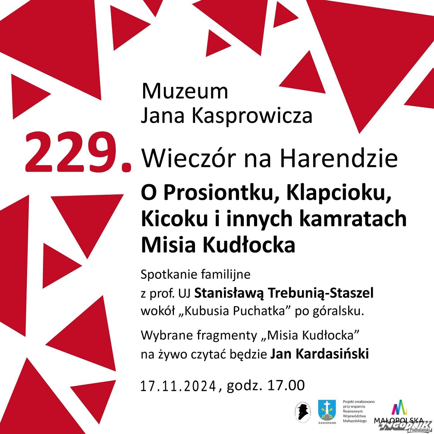 Muzeum Jana Kasprowicza zaprasza na 229. Wieczór na Harendzie: "O Prosionktku, Klapcioku, Kicoku i innych kamratach Misia Kudłocka".