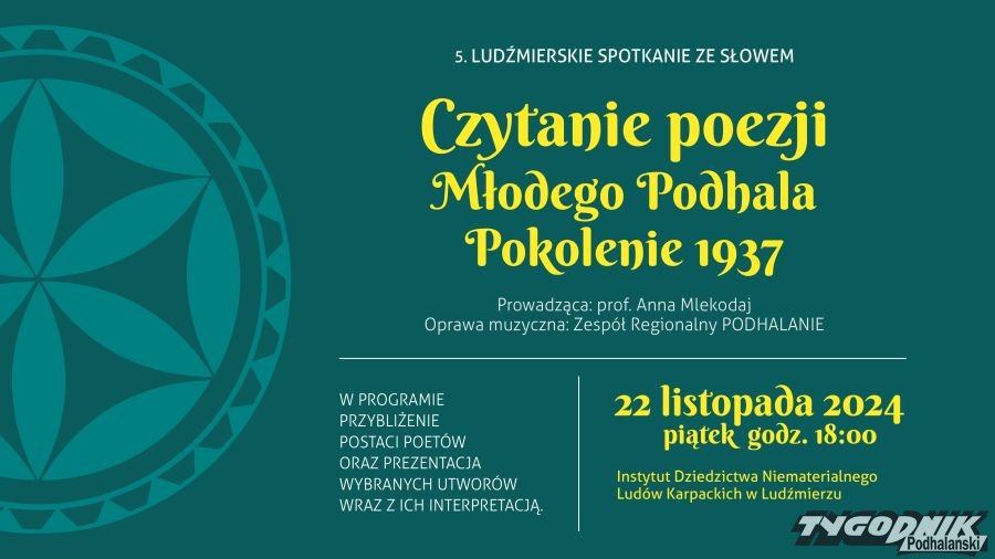 Małopolskie Centrum Kultury SOKÓŁ oraz Związek Podhalan w Polsce Oddział Ludźmierz zapraszają na literackie wydarzenie "Czytanie poezji Młodego Podhala, Pokolenie 1937". Spotkanie odbędzie się w piątek 22.11 o godzinie 18 w Instytucie Dziedzictwa Niematerialnego Ludów Karpackich w Ludźmierzu.