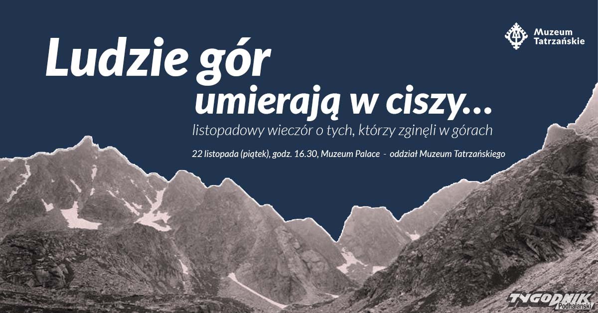 Dzień później, w piatek 22.11, Muzeum Tatrzańskie zaprasza z kolei do Muzeum Palace (ul. Chałubińskiego 7) na listopadowy wieczór "Ludzie gór umierają w ciszy…" poświęcony tym, którzy zginęli w górach. Posłuchamy opowieści Wojciecha Szatkowskiego, a na gitarze zagra Justyna Lasiak. Początek - godzina 16.30.