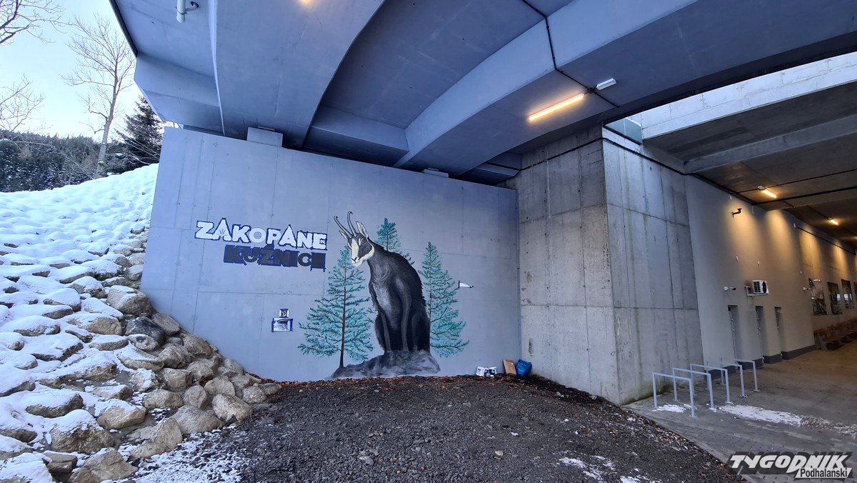 Na ścianie centrum przesiadkowego w Kuźnicach powstał mural przedstawiający kozicę.