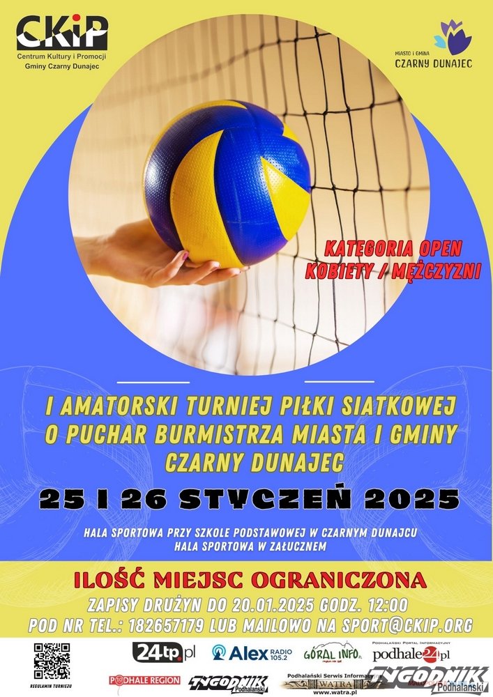 Centrum Kultury i Promocji w Czarnym Dunajcu serdecznie zaprasza na I Amatorski Turniej Piłki Siatkowej o Puchar Burmistrza Miasta i Gminy Czarny Dunajec, który odbędzie się 25 i 26 stycznia 2025r. na hali sportowej przy Szkole Podstawowej w Czarnym Dunajcu i Załucznem.