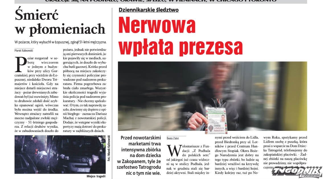 Fundacji "Z Podhala do polskich serc", którą prowadzi Jarosław Czerwiński, poświęciliśmy trzy teksty. Pierwszy pt. "Nerwowa wpłata prezesa" w styczniu 2023 roku, gdy przed sklepami w Nowym Targu spotkaliśmy kilkakrotnie wolontariuszy fundacji, którzy zbierali pieniądze na zakopiański dom dziecka. Gdy zadzwoniliśmy do dyrekcji Tatrogrodu, okazało się, że nikt o zbiórce nie wie, nie wpłynęły też z niej żadne pieniądze, mimo że zbiórka trwała już co najmniej od dwóch miesięcy.