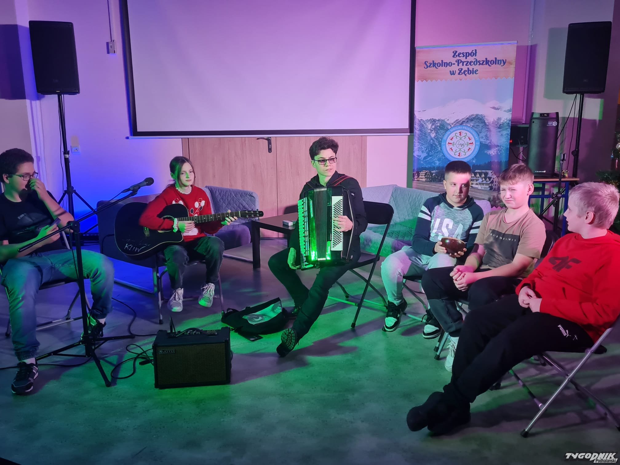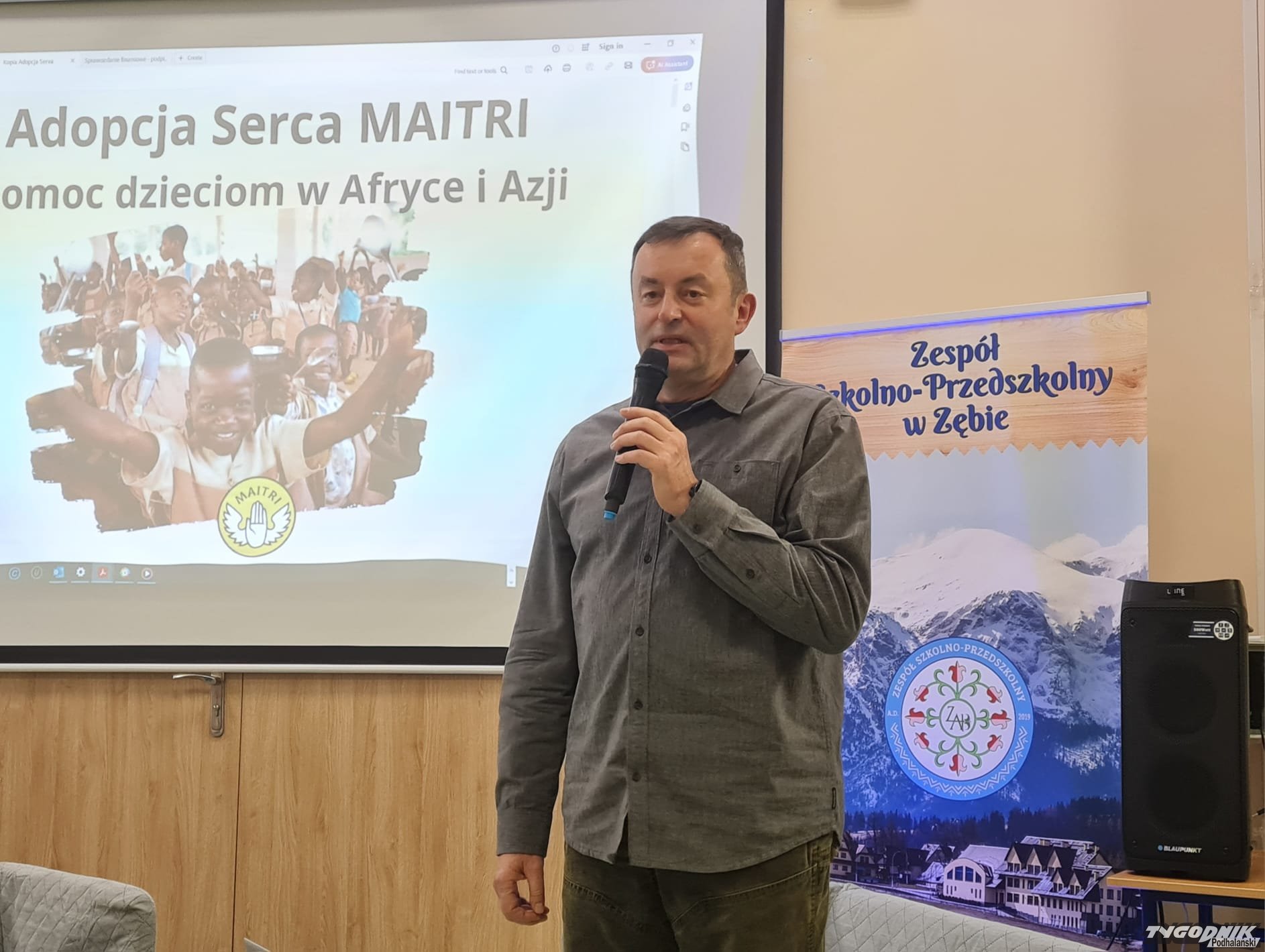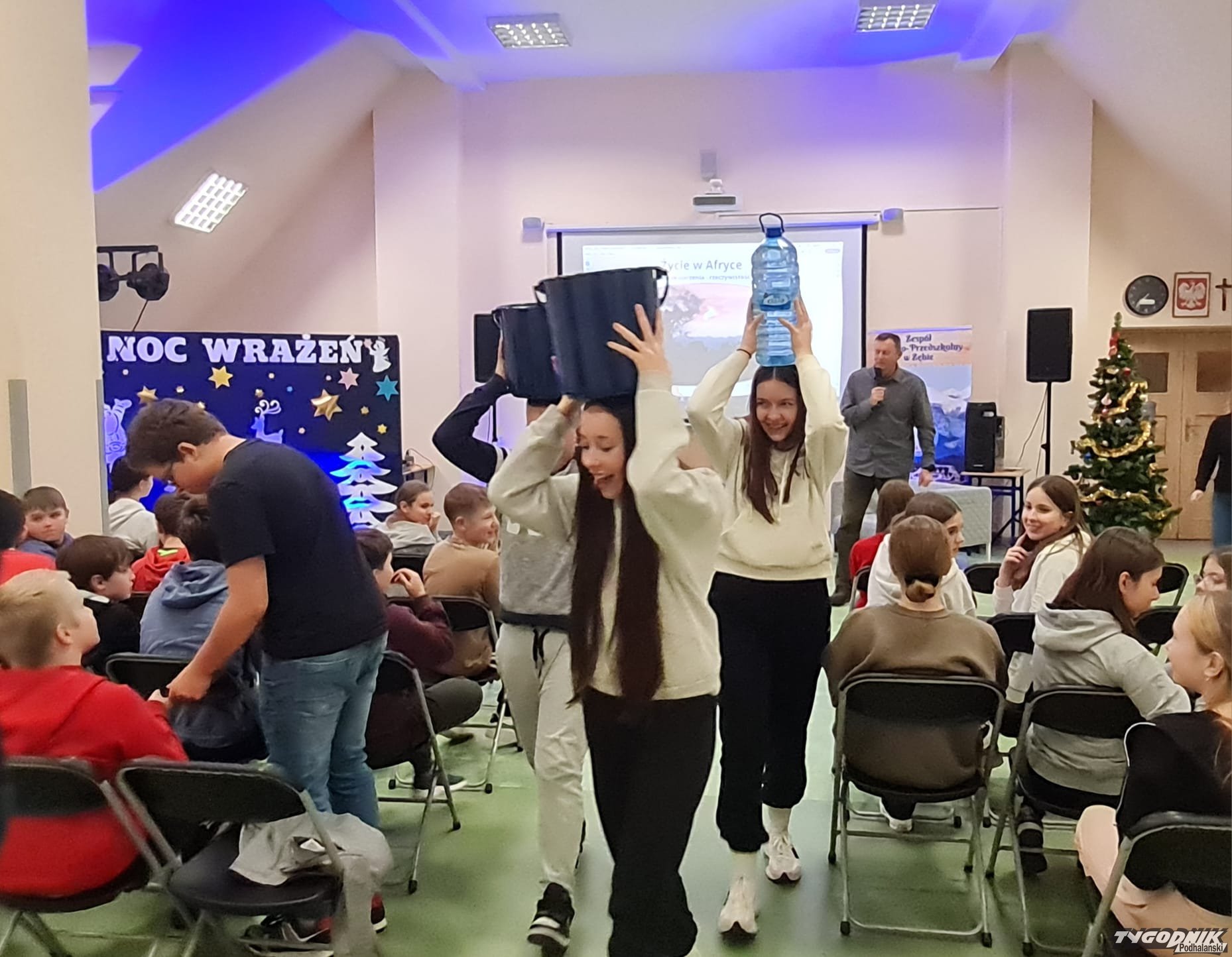 Już od ośmiu lat uczniowie starszych klas (szóstej, siódmej i ósmej) kilka razy w roku spędzają noc w szkole. W piątek 6 grudnia Noc Wrażeń w Zespole Szkolno - Przedszkolnym w Zębie była szczególna, nie tylko ze względu na jubileusz. W tym dniu nie mogło zabraknąć św. Mikołaja. Pierwszym z zaproszonych gości był Tadeusz Makulski z Gdańska, kierujący Stowarzyszeniem Solidarności z Ubogimi Trzeciego Świata "Maitri", koordynator programu Adopcji Serca i podróżnik. Opowiadał o Afryce, biedzie i potrzebie pomagania. Prezentował swoje zdjęcia i filmiki przedstawiające życie dzieci w ubóstwie, ich ciężką pracę i problemy, z którymi muszą się zmagać na co dzień. Zębiańska młodzież podczas spotkaniu uczyła się nosić wodę na głowie, którą w Afryce dzieci noszą codziennie do domu, często kilka kilometrów. Na koniec zachęcał do zaangażowania w wolontariat i pomoc potrzebującym dzieciom, chociażby przez życzliwą rozmowę że smutnym rówieśnikiem.