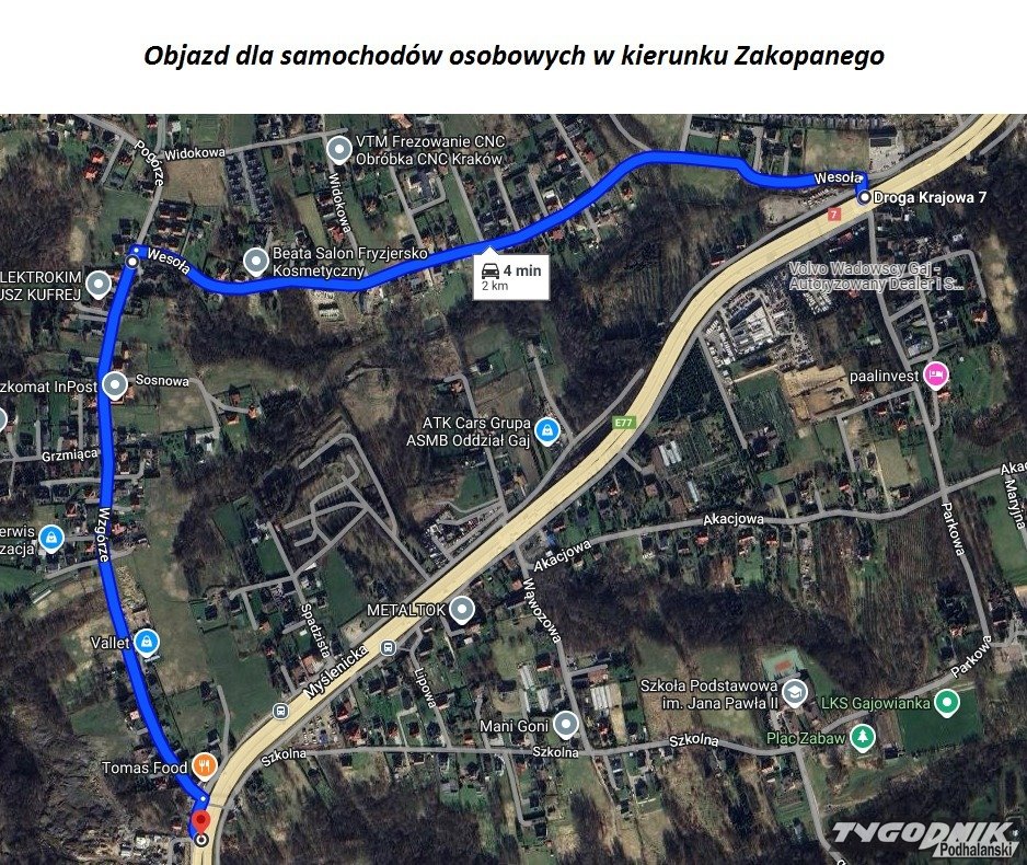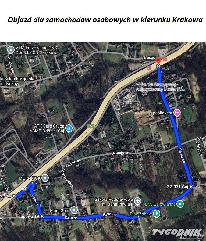 • od strony Zakopanego: z ulicy Myślenickiej (DK-7) należy skręcić w ulicę Lipową, następnie kontynuacja ulicami Szkolną i Parkową i wyjazd z powrotem na ulicę Myślenicką.