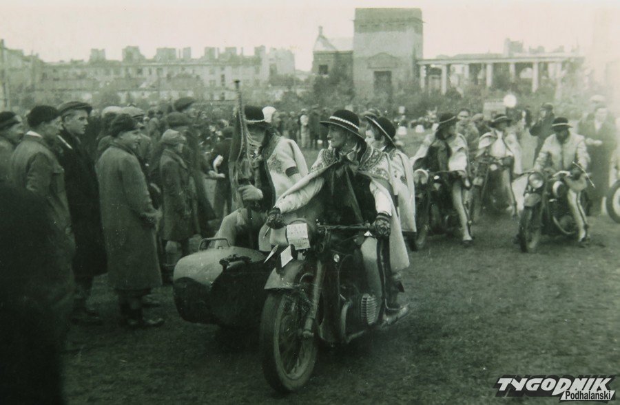 Kolejne zdjęcia. Cuchy, kapelusze z muszelkami. Górale na motocyklach. W Warszawie. Rok 1945. Morze ruin. Pociągiem przewieźli motocykle. Delegacja górali zakopiańskich w hołdzie wyzwolonej Warszawie. - Mój ojciec był szalony. On to poprowadził. Zrobili taki paradny przejazd motocyklami - opisuje co widać na zdjęciu mój rozmówca.