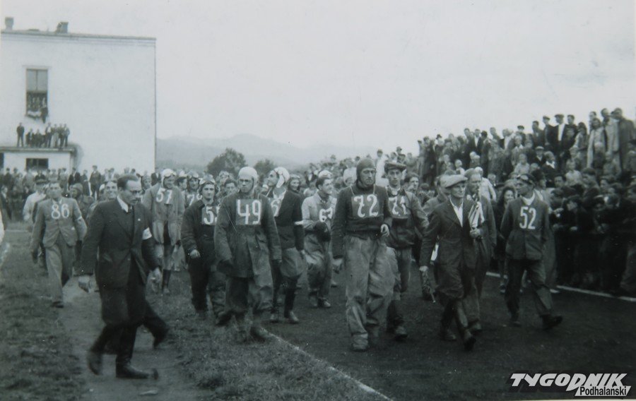 Znany budynek szkolny. Kto dziś pamięta, że na Wilczniku mieliśmy w Zakopanem żużel? Wyścigi na torze przy szkole. Grupę żużlowców prowadzi do startu Edward senior.