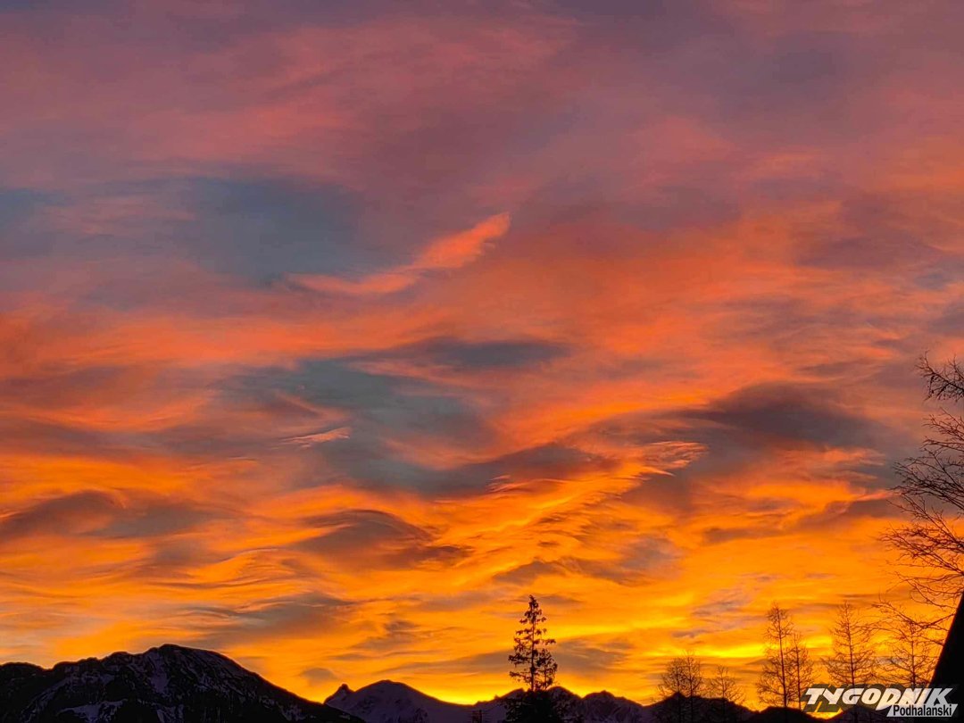 Wieczorową porą niebo nad Gubałówką i Tatrami rozświetliło się żółtymi, pomarańczowymi, różowymi barwami. Na kilkanaście minut zrobiło się zupełnie kolorowo. To zwiastun nadciągającego silnego wiatru. Instytut Meteorologii i Gospodarki Wodnej ogłosił już ostrzeżenie pierwszego stopnia przed wichurą. Na Kasprowym już teraz porywy wiatru dochodzą do 95 km na godz. Nad ranem ma wiać do 120 km na godz. w Tatrach i 90 na Podhalu.