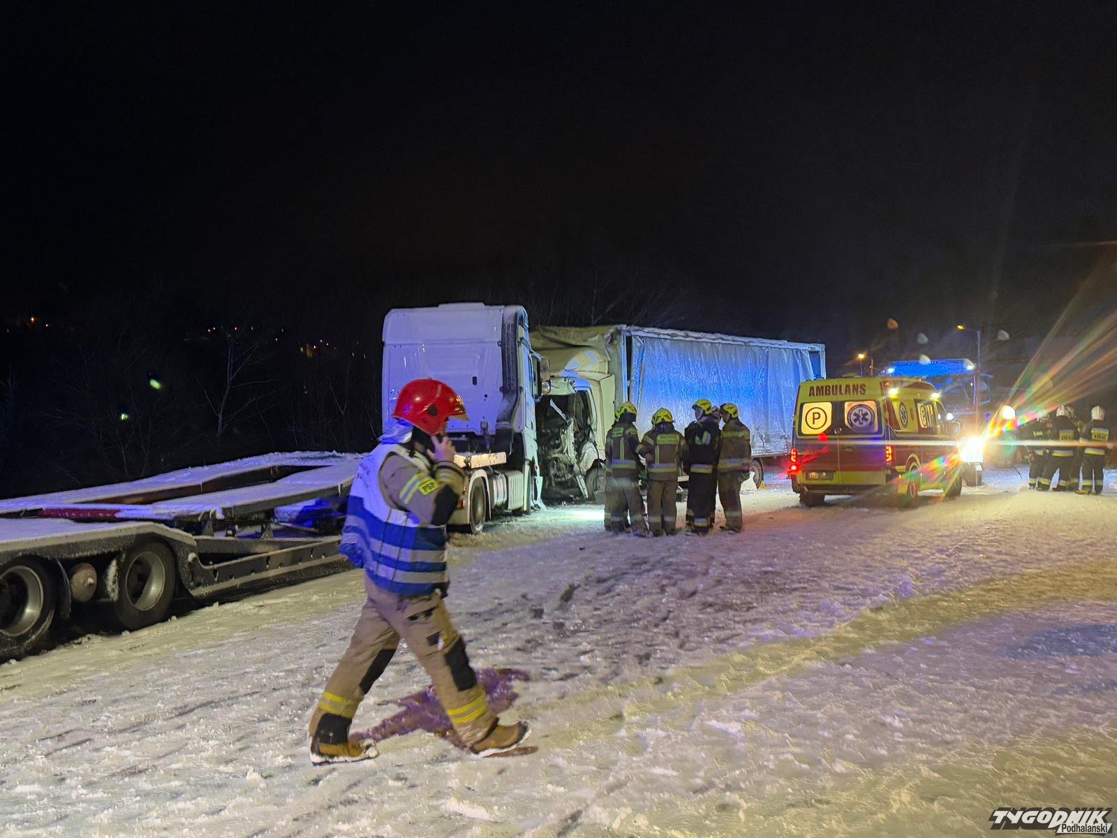 Według pierwszych informacji czołowo zderzyły się tam dwa tiry. Na miejscu pracują strażacy, policjanci, zespoły ratownictwa medycznego. Wezwano również śmigłowiec ratunkowy, który wylądował na drodze. Ok. godz. 17:15 śmigłowiec zabrał rannego kierowcę do szpitala. W sumie ranne zostały dwie osoby. Trasa prowadząca przez Jabłonkę jest całkowicie zablokowana. Apelujemy do kierowców o ostrożność. Na drogach panują coraz trudniejsze warunki.