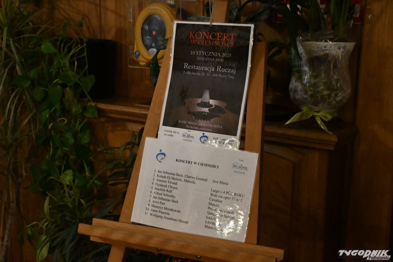 Koncert w ciemności zorganizował Zakład Aktywności Zawodowej od Nowa w Nowym Targu i Fundacja im. Adama Worwy. - To było wyjątkowe wydarzenie, które przeniosło nas w świat niezwykłych dźwięków i emocji zgodnie z hasłem przewodnim "Poczuj i Doceń" - podkreślała Jolanta Łapsa z Fundacji im. Adama Worwy. - Ciemność stała się areną dla naszych zmysłów, a muzyka połączyła nas w pięknym doświadczeniu. Niech takie chwile inspirują nas do otwartości na nowe doświadczenia i doceniania talentów osób z niepełnosprawnościami - dodała J. Łapsa. Przypomniała też niedawne spotkanie, którym była kolacja w ciemności. - Doprowadzałam gości z opaskami na oczach do stolików. I tu okazało się jak bardzo ogranicza mnie moja sprawność. Po doprowadzeniu osób do 8-osobowego stolika uznałam, że zadanie wykonane i chciałam odejść. Tymczasem goście nie widząc nic, nie wiedzieli co dalej - wspominała J. Łapsa.