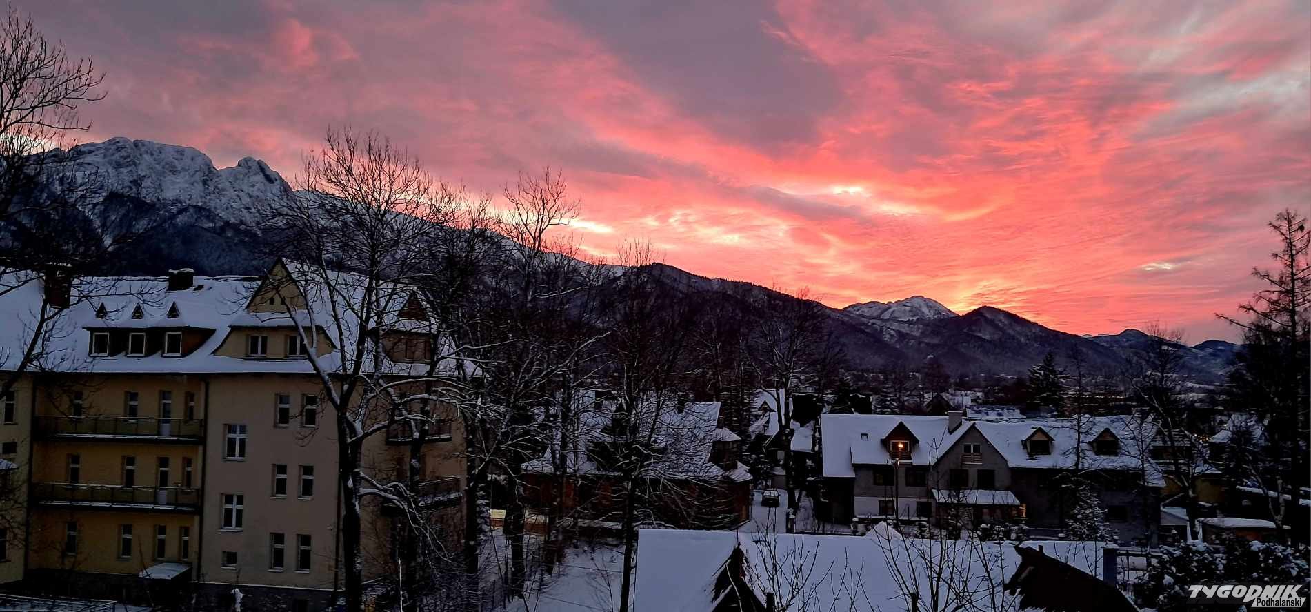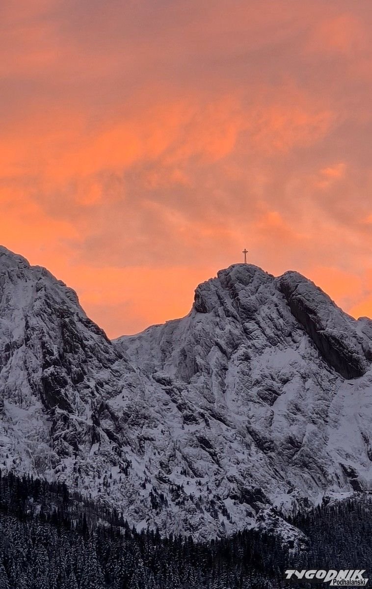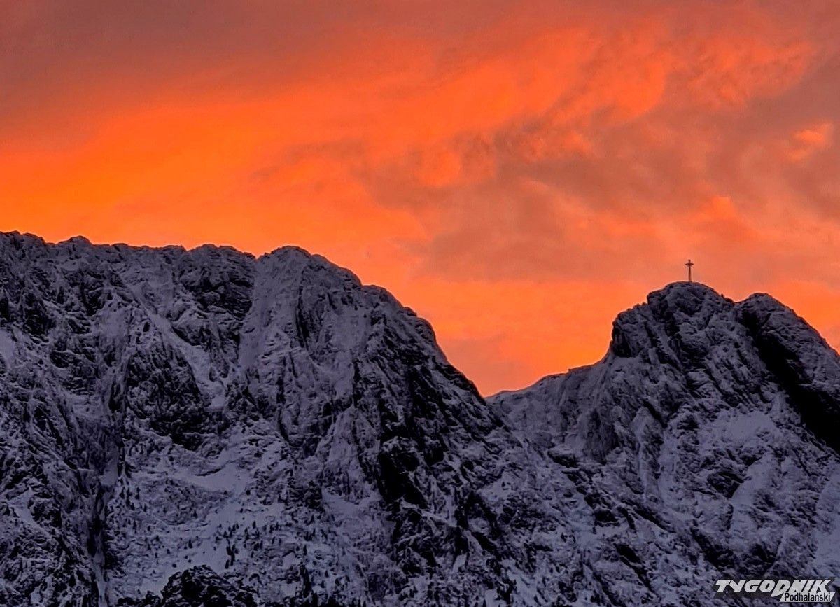 Tuż po zachodzie słońca niebo nad Giewontem zrobiło się pomarańczowe. Takie kolory mogliśmy oglądać dosłownie kilka minut. Po pięknym słonecznym dniu z północy nadciąga już zmiana pogody. Wzrasta zachmurzenie. W nocy i nad ranem zapowiadane są opady śniegu. Nie będą one już tak duże jak ostatnio, ale w sumie może spaść do 10 cm śniegu. W środę wzrośnie też prędkość wiatru do 60 km na godz. w Tatrach. W czwartek pogoda uspokoi się, a od piątku odwilż i słońce.