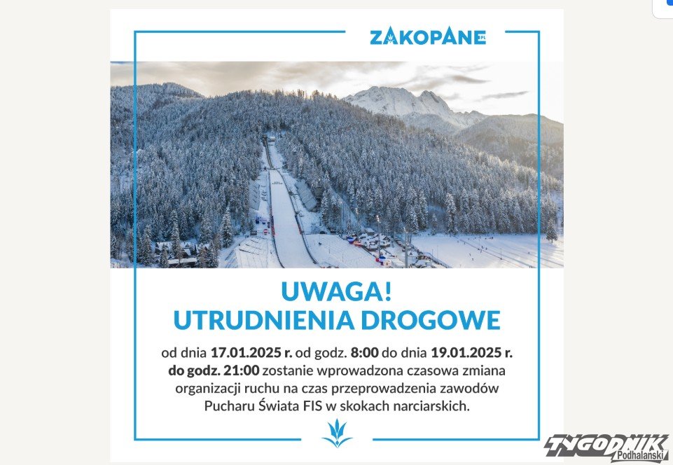 Zakopiański Urząd Miasta przypomina o zasadach bezpieczeństwa w czasie Pucharu Świata. Przesyła też komunikaty dotyczące z mian w organizacji ruchu i kursowaniu komunikacji miejskiej.