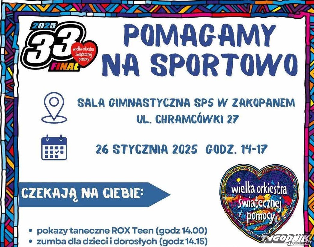 "Pomagamy na sportowo" to impreza na finał WOŚP, która odbędzie się 26 w sali gimnastycznej Szkoły Podstawowej nr 5 w Zakopanem.