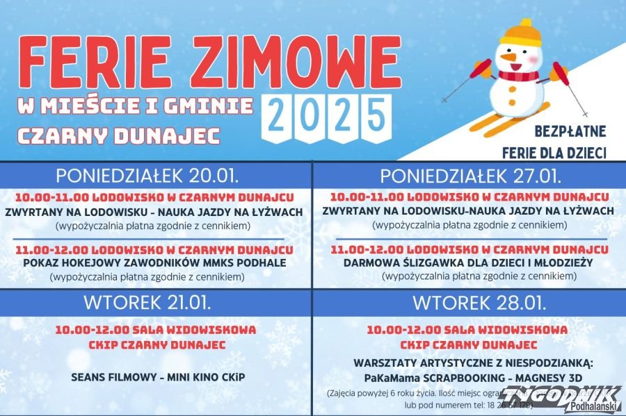 Miasto i gmina Czarny Dunajec oraz Centrum Kultury i Promocji Gminy Czarny Dunajec w ferie zapraszają dzieci i młodzież do udziału w zajęciach, spotkaniach, seansach filmowych i nie tylko.
