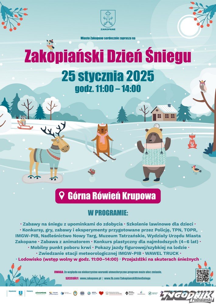 W sobotę 25 stycznia 2025 na Górnej Równi Krupowej odbędzie się Zakopiański Dzień Śniegu - zimowa, sportowa impreza skierowana do dzieci. Jej celem jest popularyzacja sportów zimowych, ruchu na świeżym powietrzu oraz wspólnego spędzania czasu na grach i zabawach na śniegu.