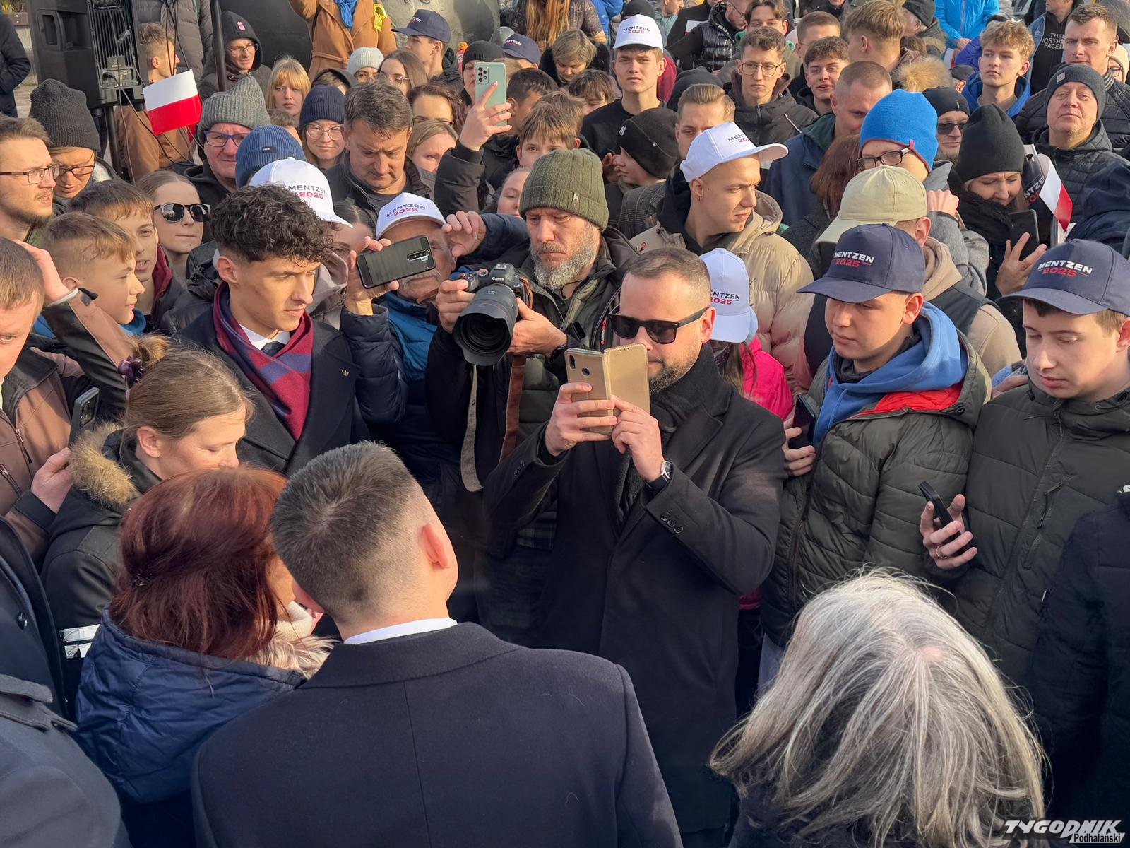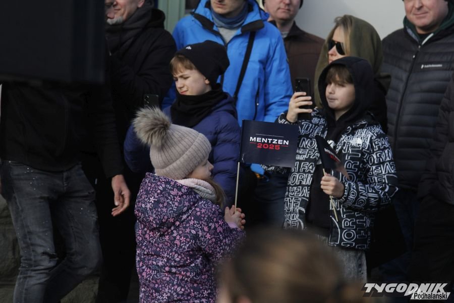 Spotkanie z kandydatem Konfederacji na prezydenta odbyło się na placu pod pomnikiem Mikołaja. Przestronny skwer niemal całkowicie wypełnił się zwolennikami. Mentzenowi towarzyszyli parlamentarzyści jego ugrupowania, między innymi Grzegorz Płaczek, Ryszard Wilk, czy Konrad Berkowicz.