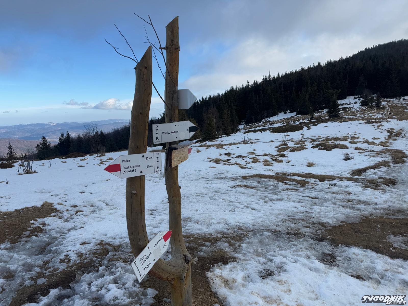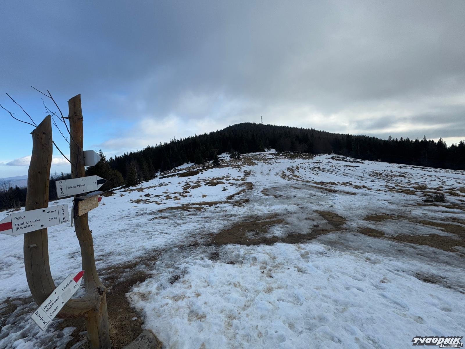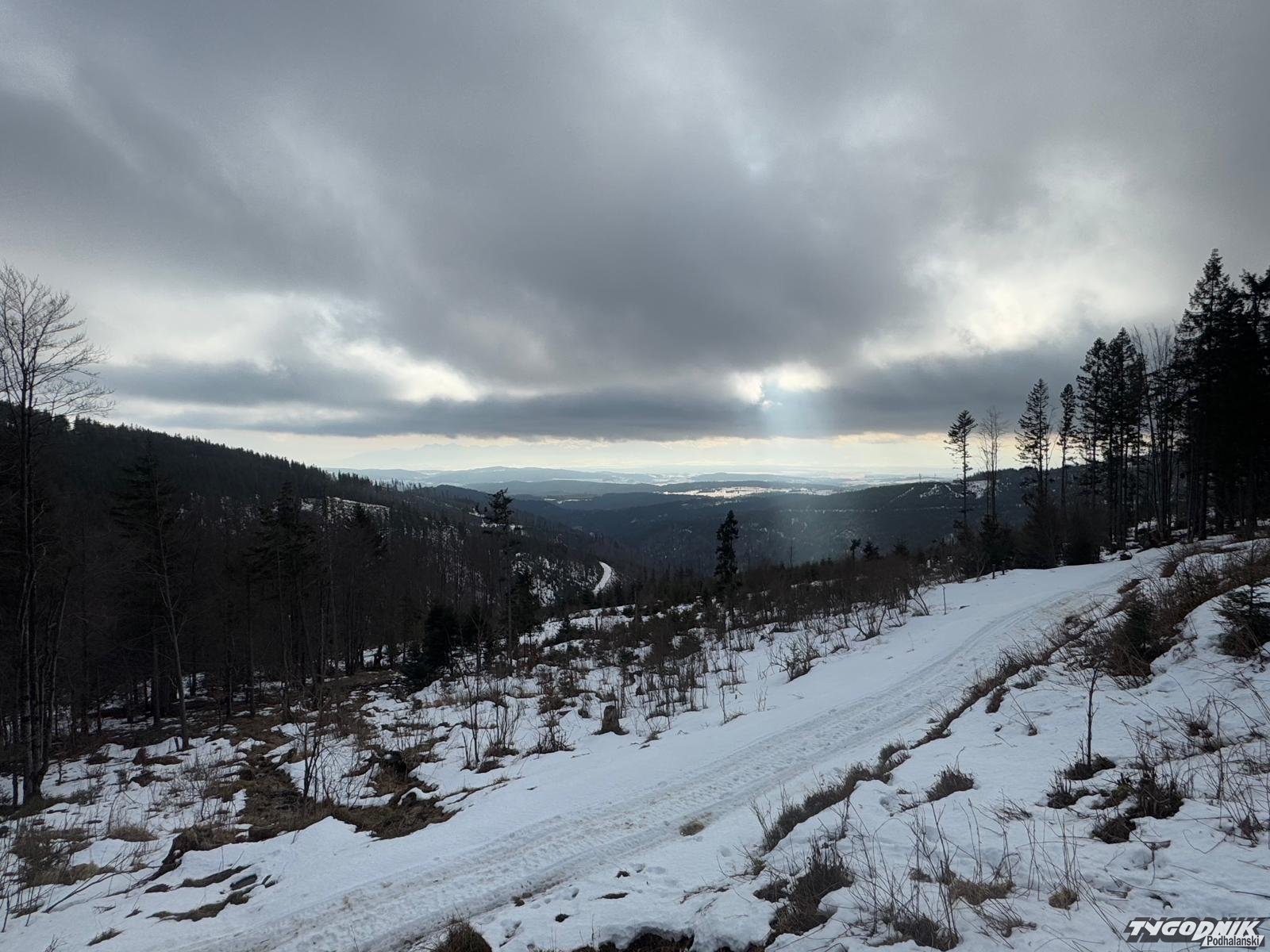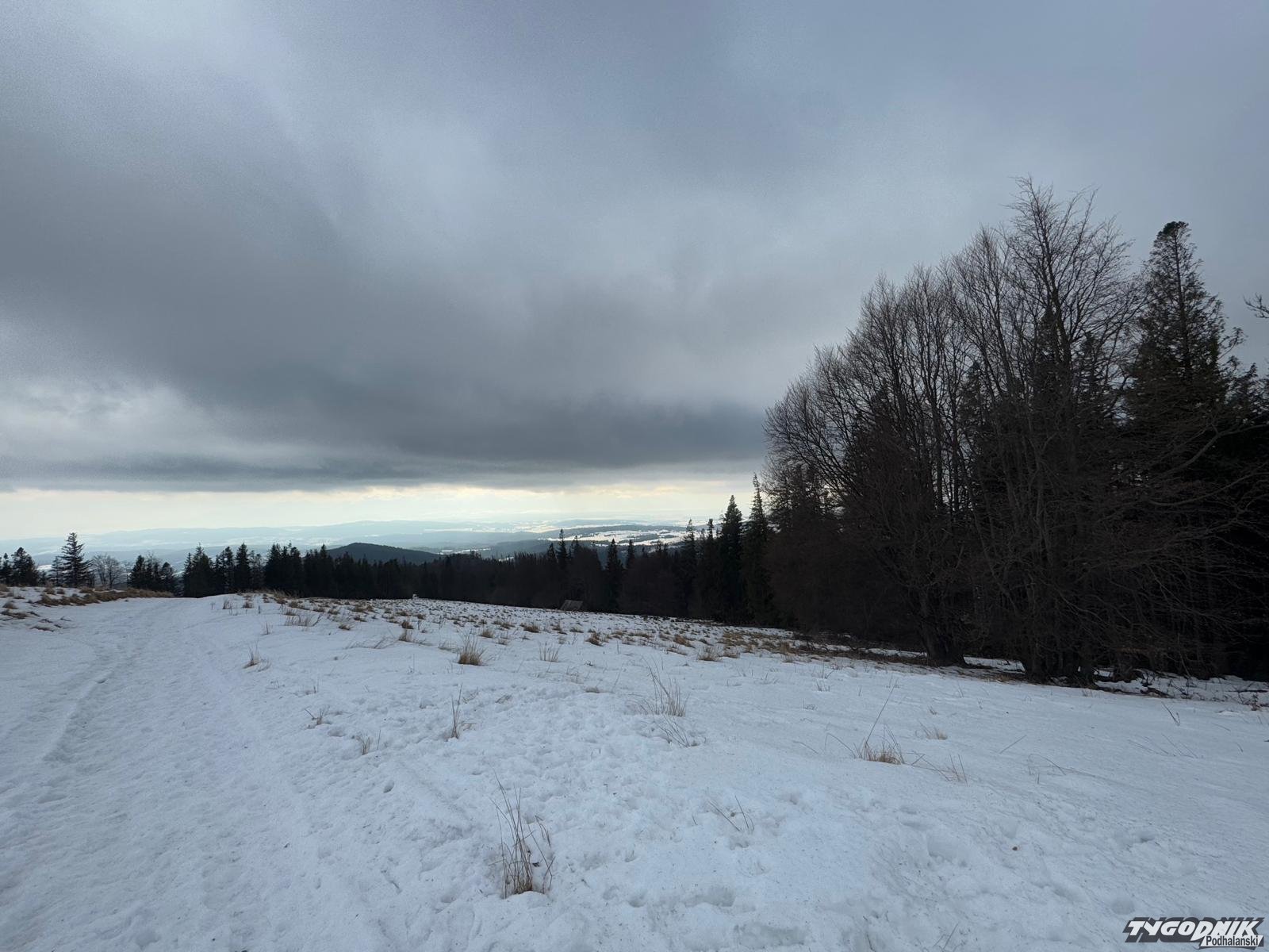 W Beskidach zapanowała niemal prawdziwa wiosna. Śniegu trzeba szukać w wyższych położeniach, błoto nie jest specjalnie dokuczliwe. Tych co wyruszyli dziś na szlaki aura obdarowała pięknymi widokami. Było też całkiem ciepło z wyjątkiem wyższych partii, Na grzbietach wiał porywisty wiatr. Wichura zmuszał do szukania ochrony w kapturze ale jednak nie utrudniała marszu.