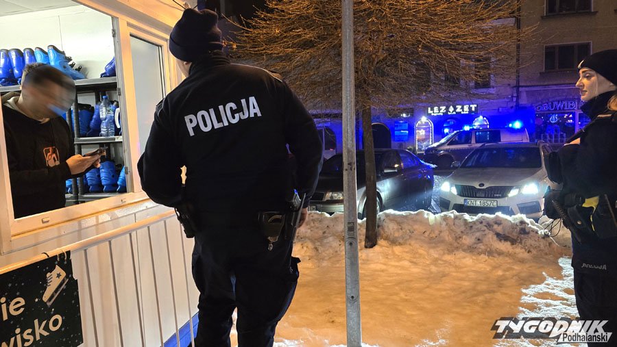 Czwartek godz. 17. 30. Punkt wypożyczania łyżew na nowotarskim rynku obserwują pracownice Urzędu Skarbowego. To prawdopodobnie rutynowa kontrola wydawania paragonów. Nagle podchodzą do sprzedawcy, przekonane, że paragon nie został wydany. Oskarżany o to mężczyzna nie chce się wylegitymować, jest podenerwowany, awanturuje się. Sytuacje uspakaja dopiero wezwany na miejsce partol policji.