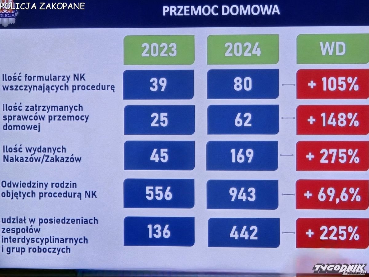 Dzisiaj w siedzibie Komendy Powiatowej Policji w Zakopanem odbyła się narada podsumowująca pracę tatrzańskich policjantów w 2024 r. Przedstawiono też ciekawe dane dotyczące liczby zgłaszanych przestępstw i zatrzymań sprawców przemocy domowej w powiecie tatrzańskim.