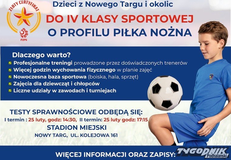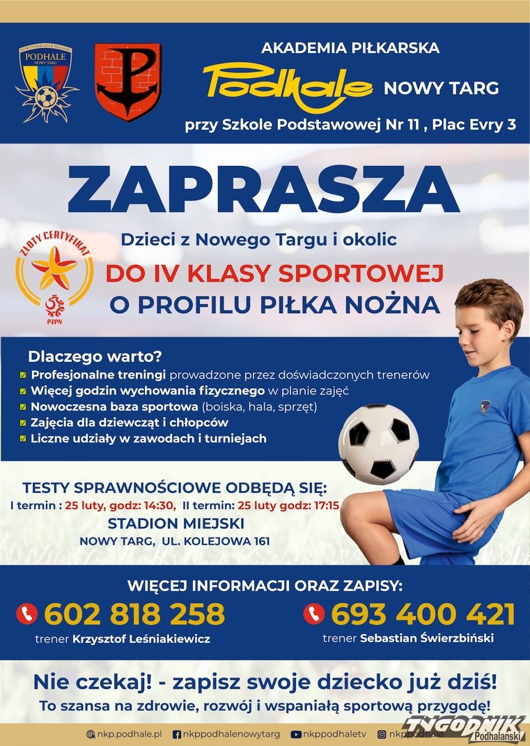 Akademia Piłkarska Podhale Nowy Targ, działająca przy Szkole Podstawowej nr 11 w Nowym Targu, ogłasza nabór do IV klasy sportowej o profilu piłka nożna. To doskonała okazja dla dzieci z Nowego Targu i okolic, by połączyć naukę z pasją do futbolu, rozwijając swoje umiejętności pod okiem doświadczonych trenerów.