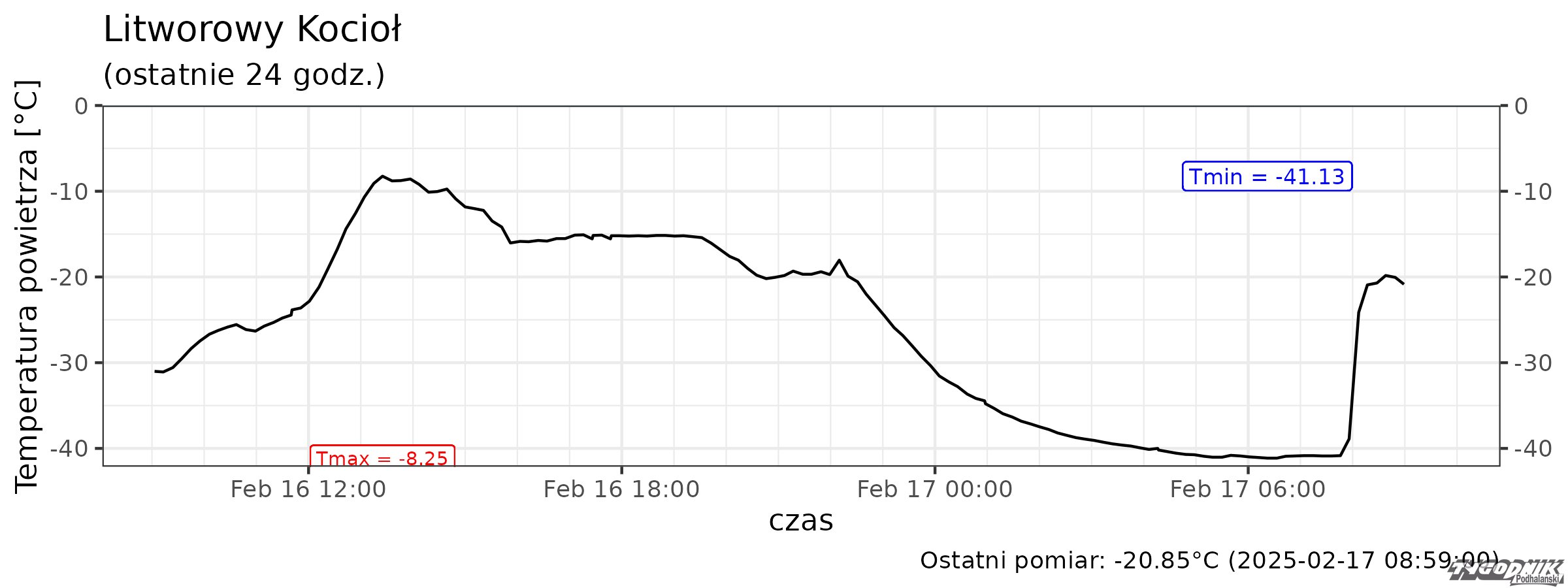 Dzisiejszej nocy termometr pokazał tam aż -41,1 st. C. Oznacza to wyrównanie najniższej w historii temperatury w Polsce - w styczniu 1940 roku w Siedlcach zanotowano również -41 st. C. W Kotle Litworowym mamy sprzyjające do powstawania silnych mrozów warunki. Leży on wysoko w górach i jest głęboki. Dzięki temu temperatura tam jest o wiele niższa niż chociażby na Kasprowym czy Łomnicy.