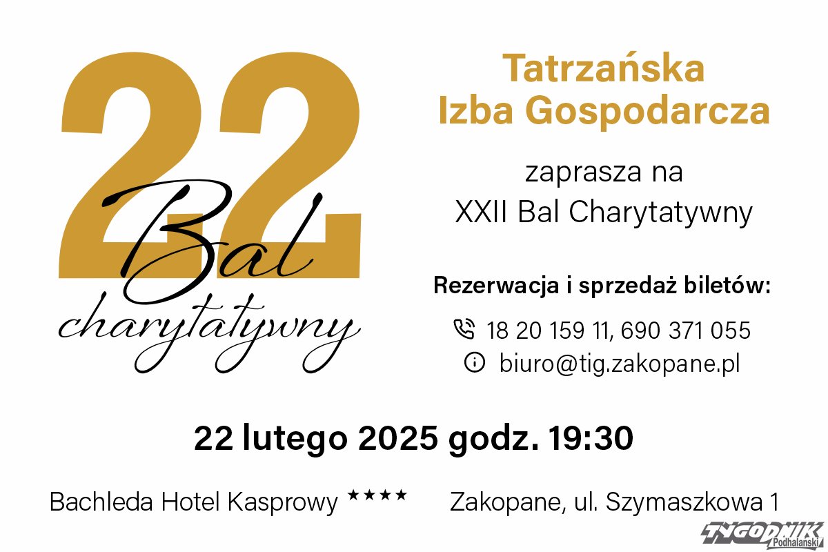 Zapraszamy na XXII Charytatywny Bal Tatrzańskiej Izby Gospodarczej w sobotę 22.02 o godzinie 19.30 w Bachleda Hotel Kasprowy**** (Zakopane, ul. Szymaszkowa 1).