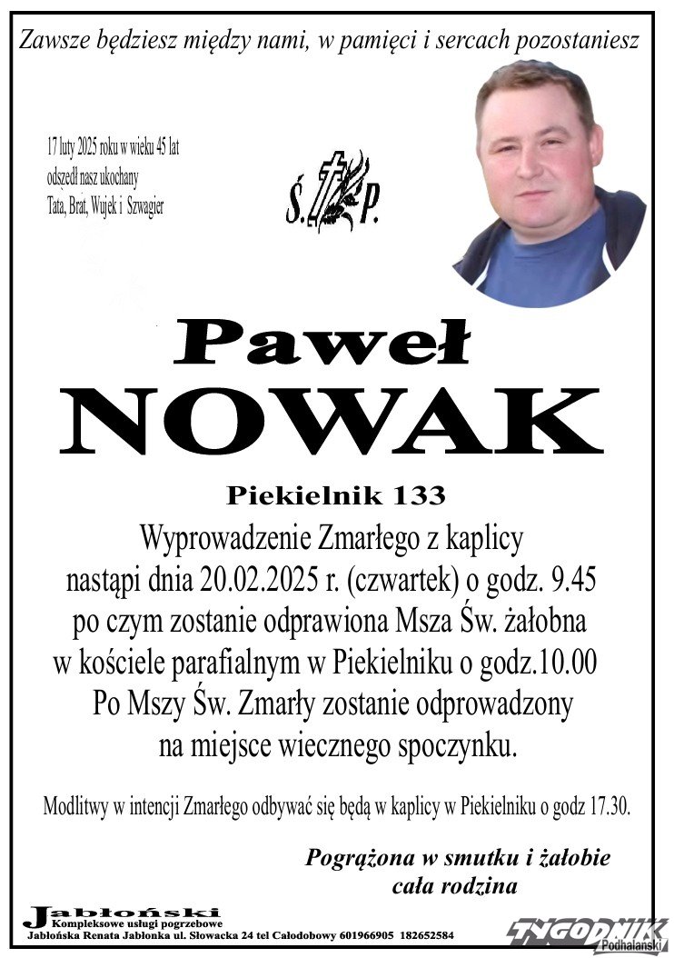 W wieku 45 lat zmarł Paweł Nowak, jeden z druhów z Ochotniczej Straży Pożarnej w Piekielniku. "Ze smutkiem przyjęliśmy wiadomość, że na wieczną służbę odszedł nasz kolega, druh Paweł Nowak" - napisali w mediach społecznościowych strażacy z OSP Piekielnik.