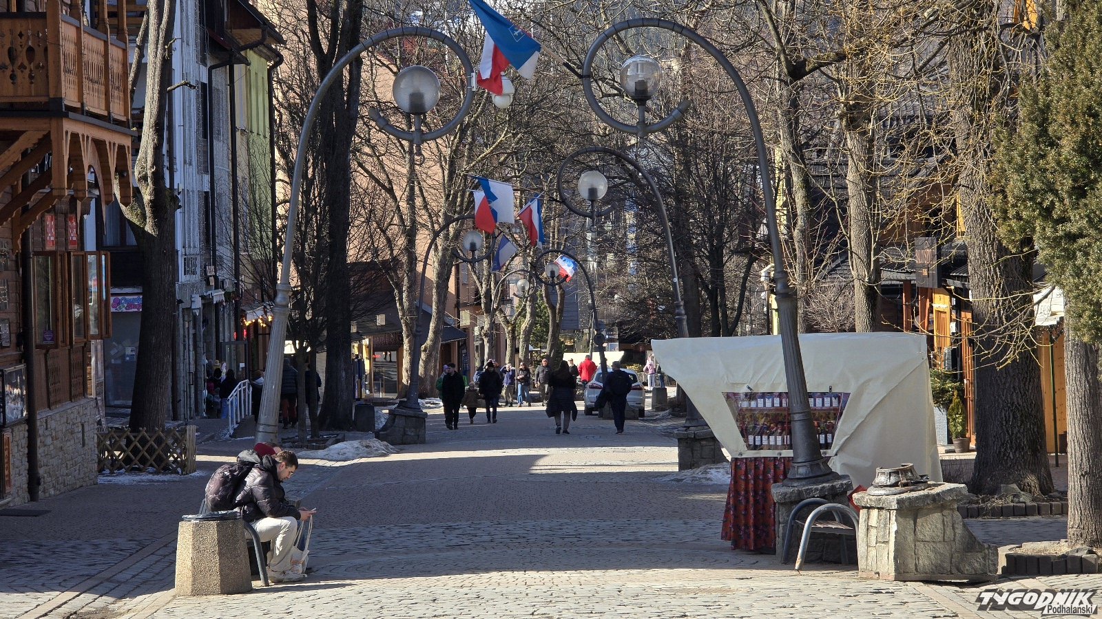 Na Krupówkach niewielu turystów, a pogoda coraz bardziej wiosenna.