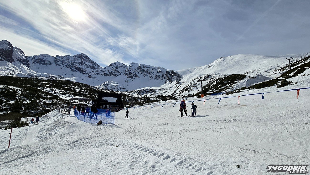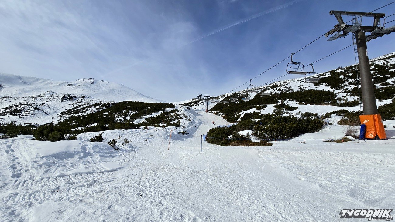 Najlepsze o poranku, gdy śnieg jest jeszcze zmrożony. Na trasie dziś tłoku nie ma, a widoki piękne. To już jest czas, gdy można złapać wiosenną opaleniznę. Niestety, wyciąg w Kotle Goryczkowym nie ruszył ze względu na zbyt małą pokrywę śniegu i tak pewnie zostanie do końca sezonu.