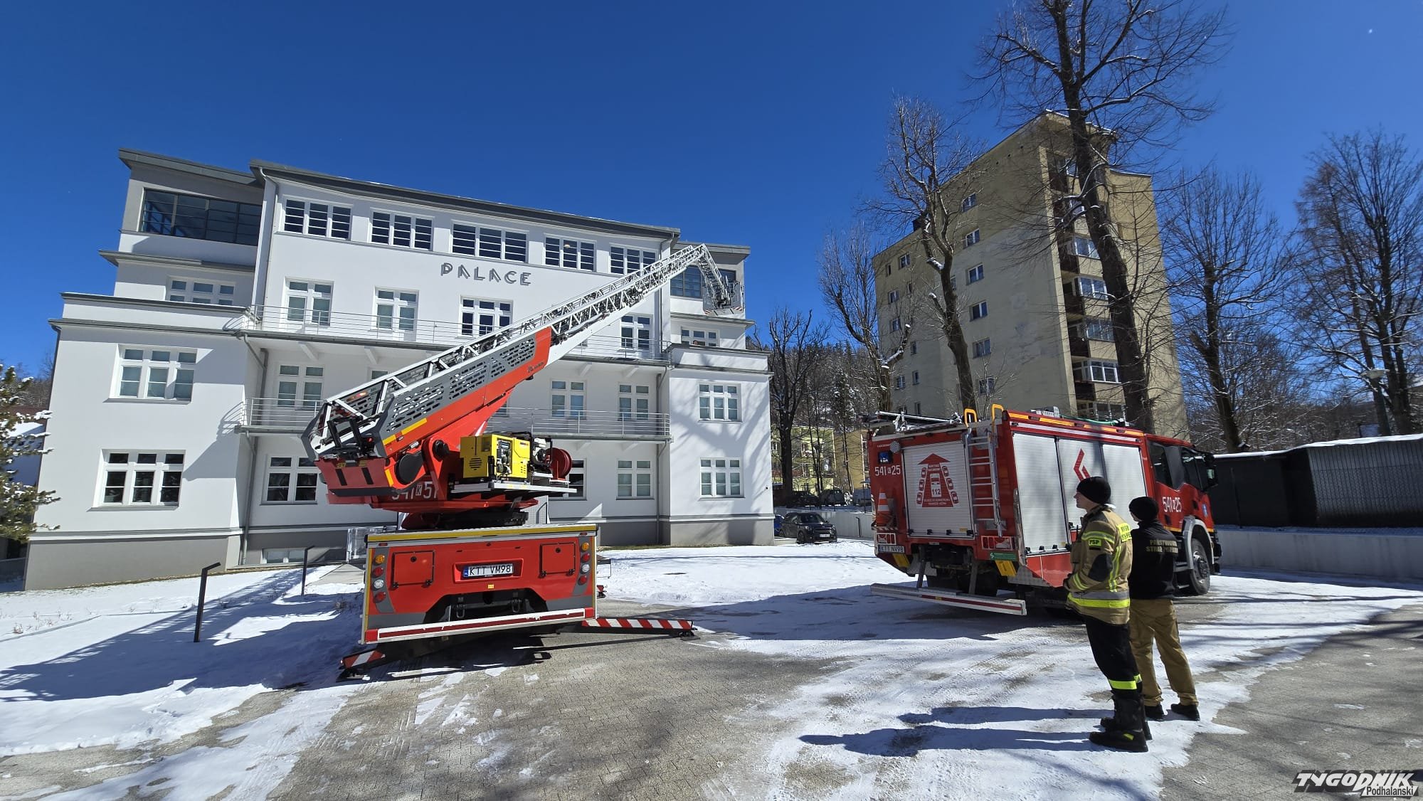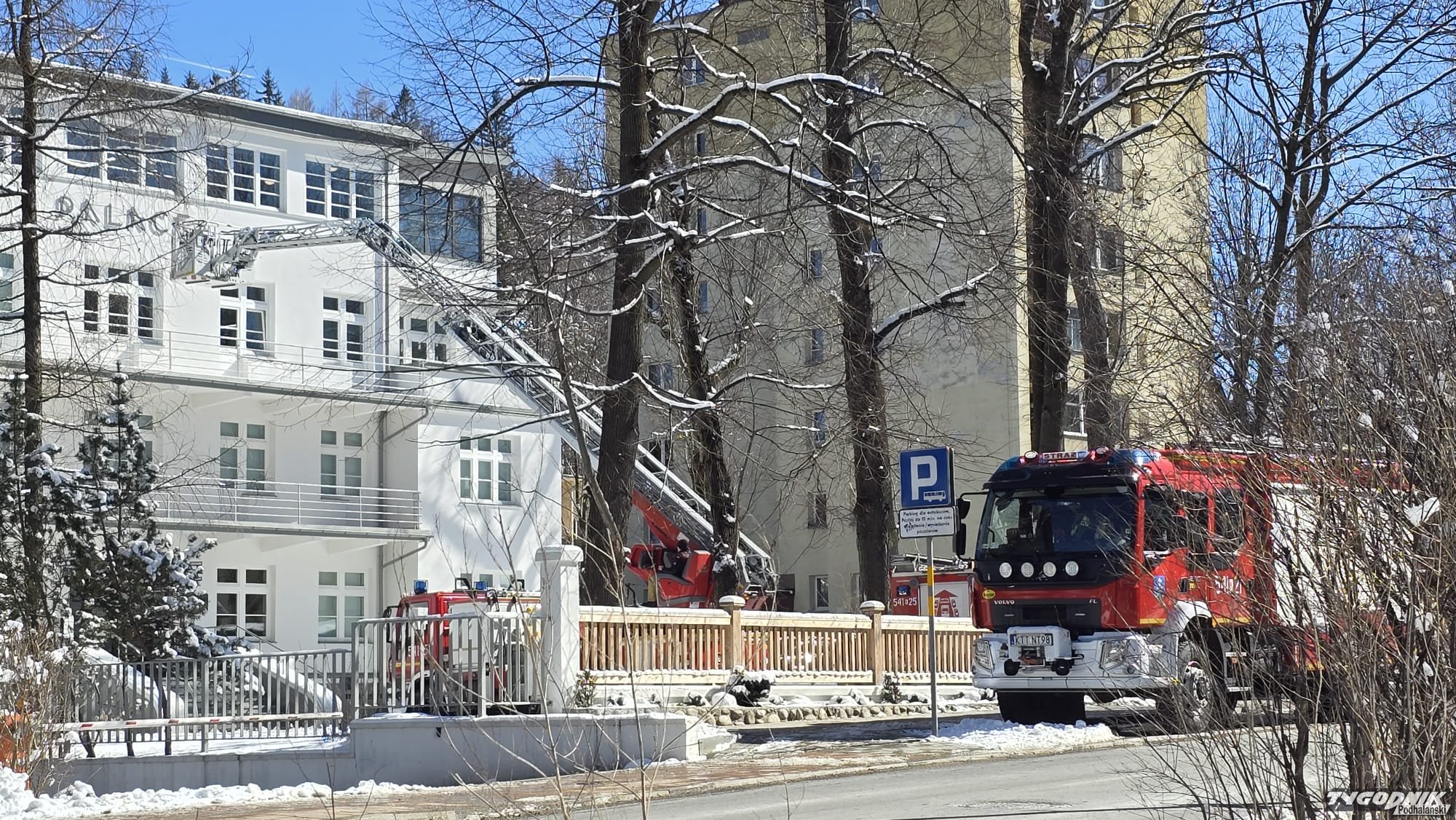 Przed Muzeum Palace przy ul. Chałubińskiego pojawiły się strażackie samochody z Jednostki Ratowniczo-Gaśniczej z Zakopanego. Jest także drabina, która od ponad roku służy zakopiańskim strażakom. Dzięki niej możliwe są akcje gaśnicze w najwyższych budynkach w Zakopanem.