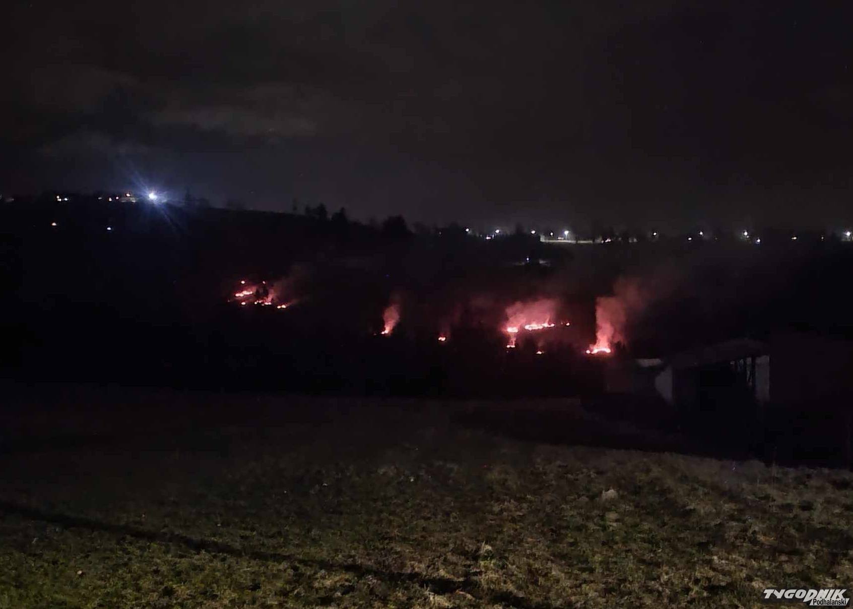 Strażacy walczą z wieczornym pożarem traw w Leszczynach w gminie Biały Dunajec.