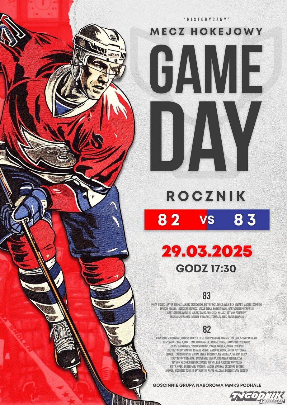 Początek meczu dziś (sobota 29.03. o godz. 17.30). HW historycznym meczu hokejowym Game Day zmierzą się hokeiści z roczników 1982 i 1983. Mecz ma pokazać, że hokej to sport rodzinny i wesprzeć nabór najmłodszych hokeistów do MMKS Podhale.