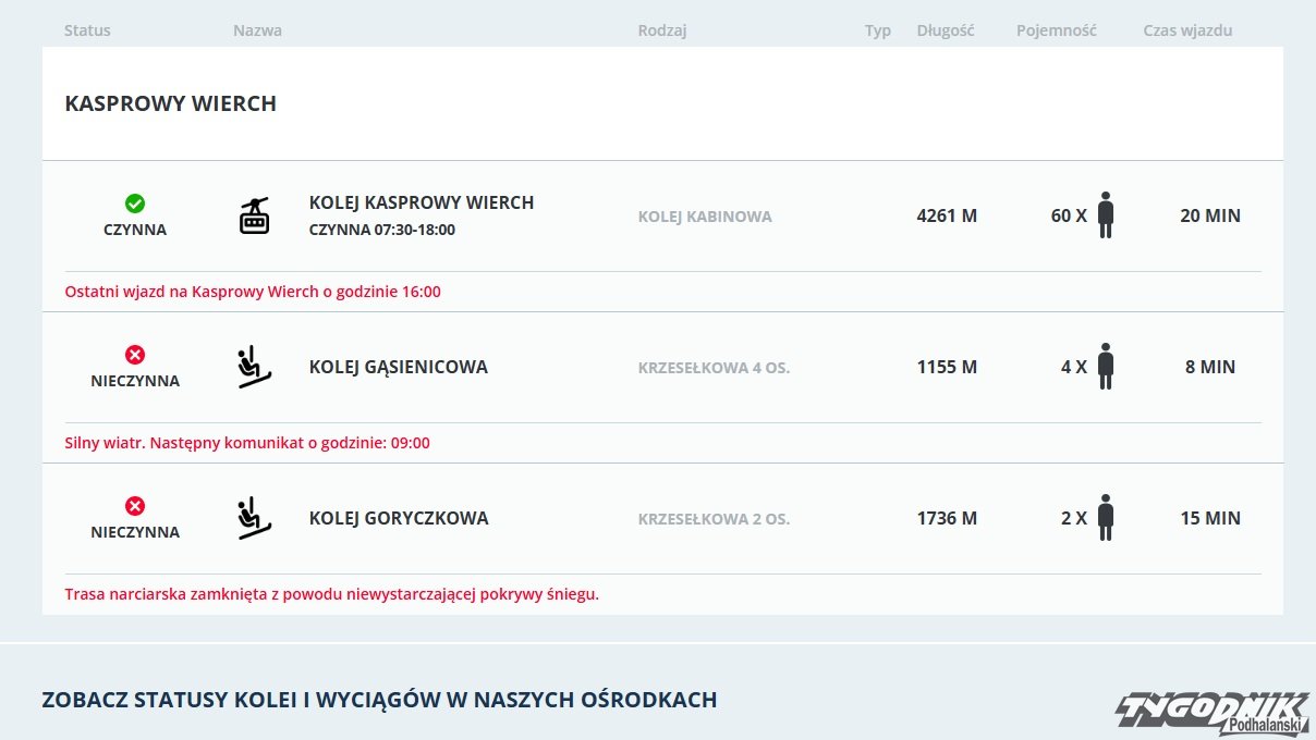 Jak podaje aktualny komunikat Polskich Kolei Linowych, zbyt silny wiatr uniemożliwia uruchomienie kolei w Kotle Gąsienicowym na Kasprowym Wierchu.