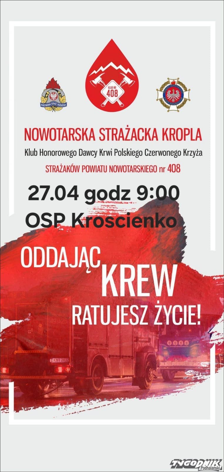 W niedzielę, 27 kwietnia o godz. 9:00 rozpocznie się akcja krwiodawstwa Nowotarska Strażacka Kropla, organizowana w OSP Krościenko.