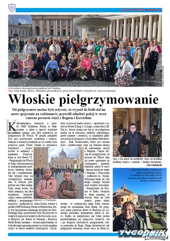 - Pielgrzymka do Włoch w Roku Jubileuszowym to niezapomniane przeżycie, zarówno duchowe jak i wspólnotowe. Taki wyjazd staje się szczególnym momentem, w którym pielgrzymi nie tylko pogłębiają swoją wiarę, ale także integrują się jako wspólnota, doświadczając razem modlitwy, refleksji i wzajemnego wsparcia - podkreśla ks. Artur Kulak, wikary z parafii NMP Królowej Polski w Miętustwie, który był inicjatorem zimowego wyjazdu do Italii.