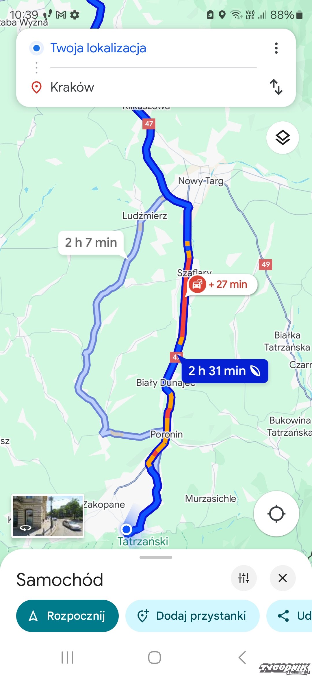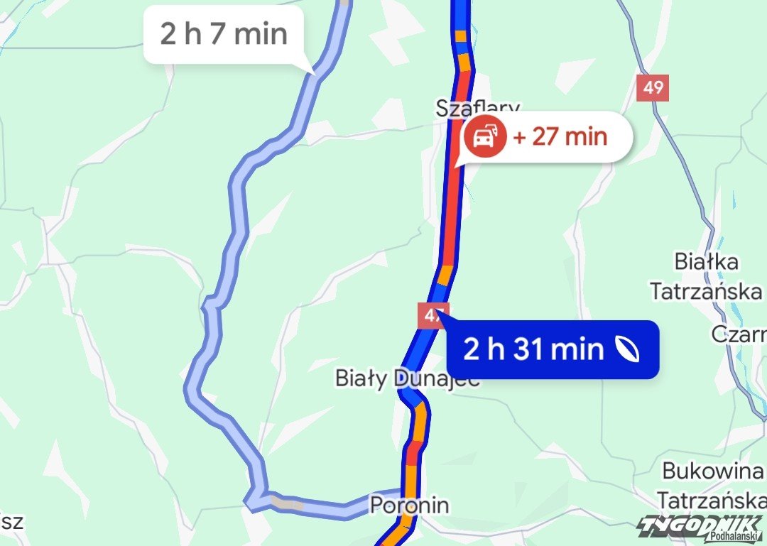 Większość turystów, którzy na Święta Wielkanocne przyjechali na Podhale zaplanowała powrót dopiero na wtorek. Dziś rano na trasę do Krakowa wyruszyło wielu z nich. To spowodowało powstanie dużego zatoru w rejonie Szaflar w stronę Nowego Targu. Tam w kroku stoimy nawet pół godziny. Nawigacja prowadzi objazdem przez Ząb i Czerwienne. O godz. 10:40 taką trasą dojedziemy do nowego odcinka zakopianki z Nowego Targu w stronę Krakowa znacznie szybciej.
