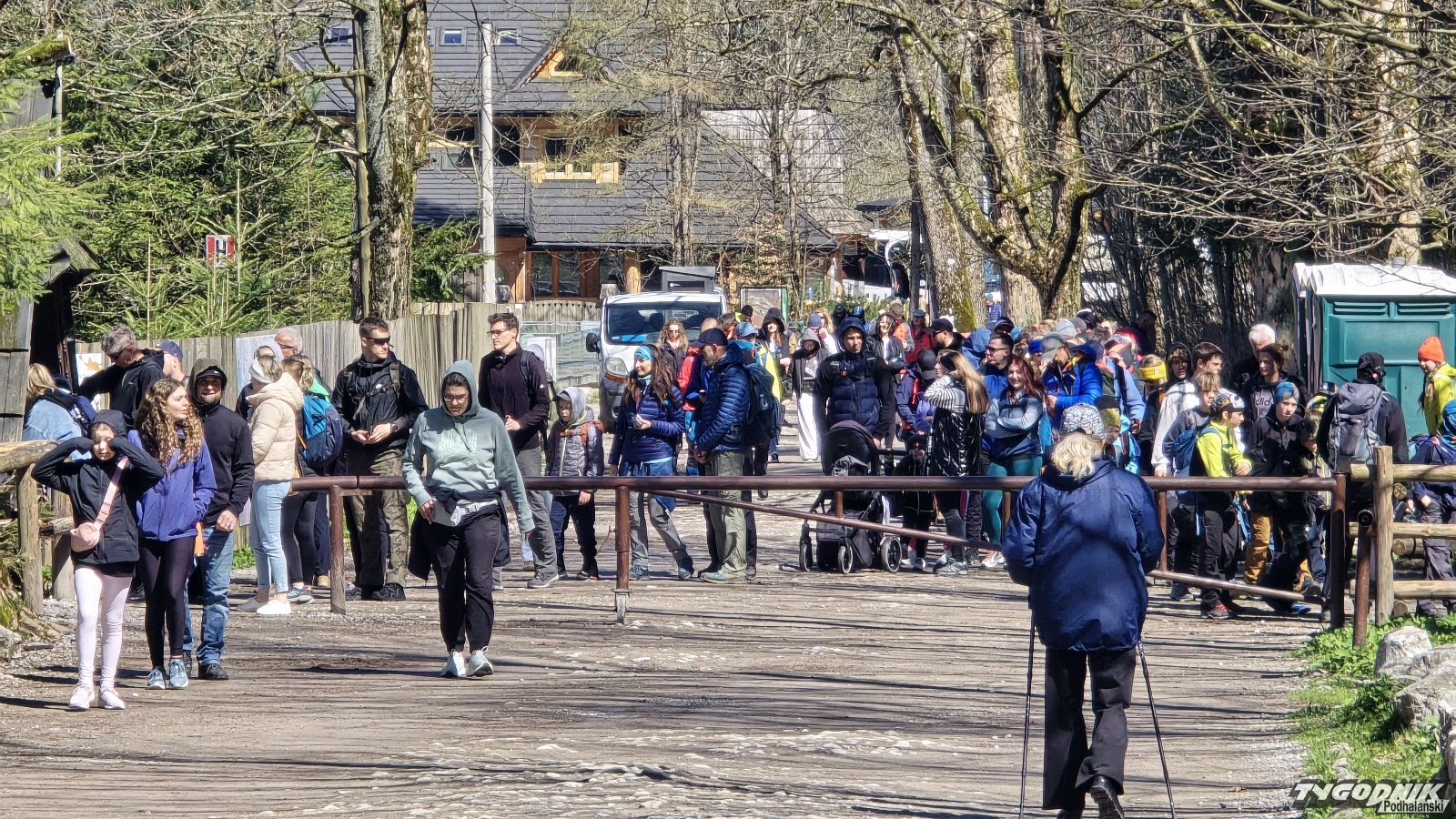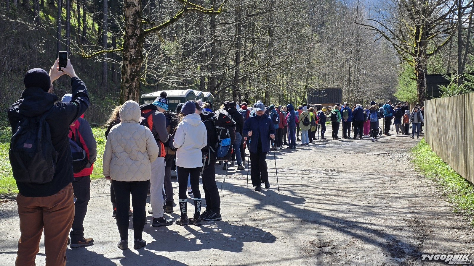 Turyści najwyraźniej lubią dłużej pospać, a może czekali aż zrobi się nieco cieplej. Taką kolejkę do wejścia do Doliny Kościeliskiej napotkaliśmy ok. godz. 10:30. Nic dziwnego, dziś w Tatrach dużo słońca, ale dość chłodno. Na długi weekend zapowiadana jest słoneczna i cieplejsza pogoda.