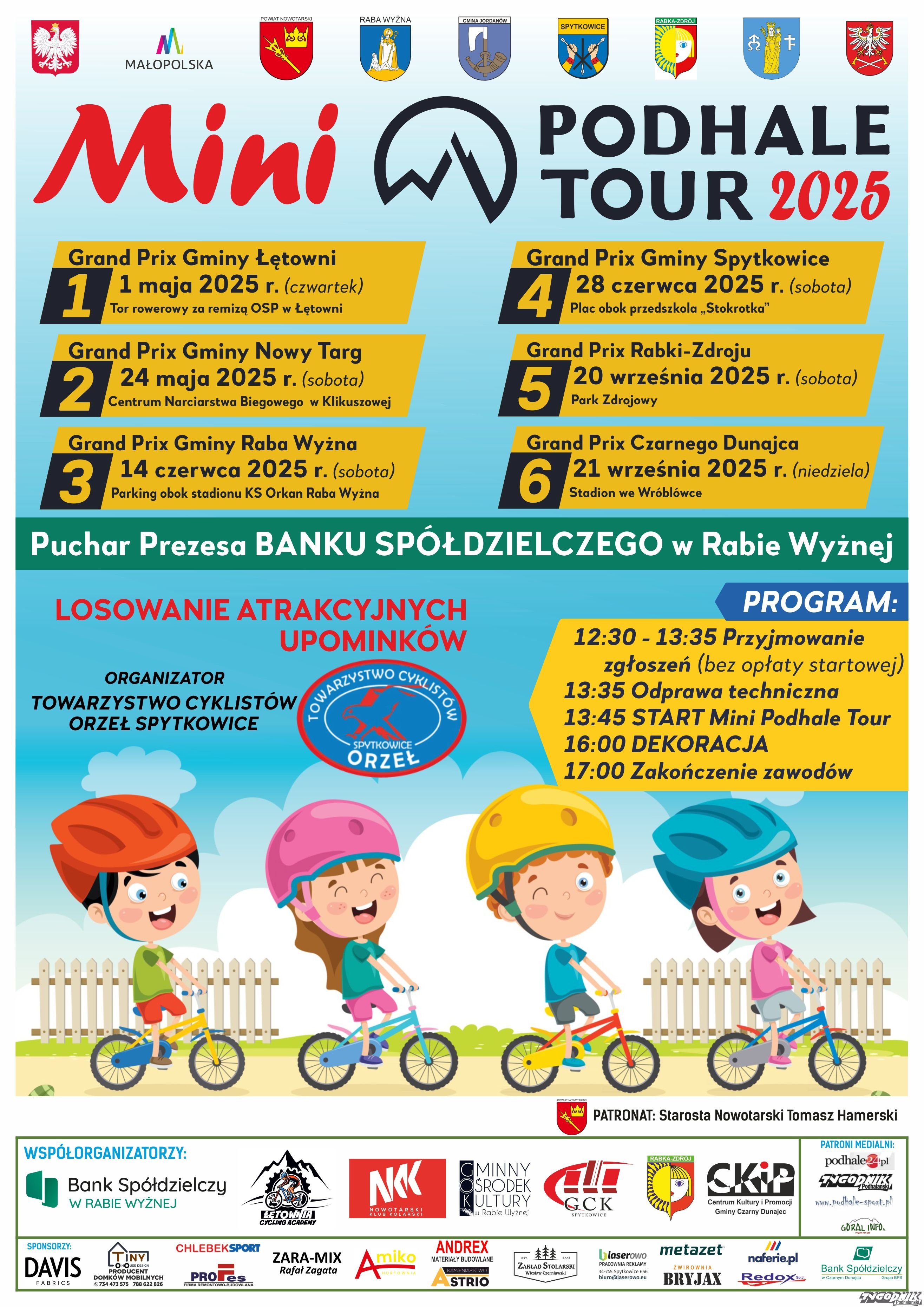 Pierwszy etap Mini Podhale Tour w czwartek 1.05. Będzie to Grand Prix Łętowni, które rozegrane zostanie na torze rowerowym za remizą OSP w Łętowni. Kolejne etapy to: 24.05 Grand Prix Gminy Nowy Targ, 14.06 Grand Prix Gminy Raba Wyżna, 28.06 Grand Prix Gminy Spytkowice, 20.09 Grand Prix Rabki-Zdroju i 21.09 Grand Prix Czarnego Dunajca.