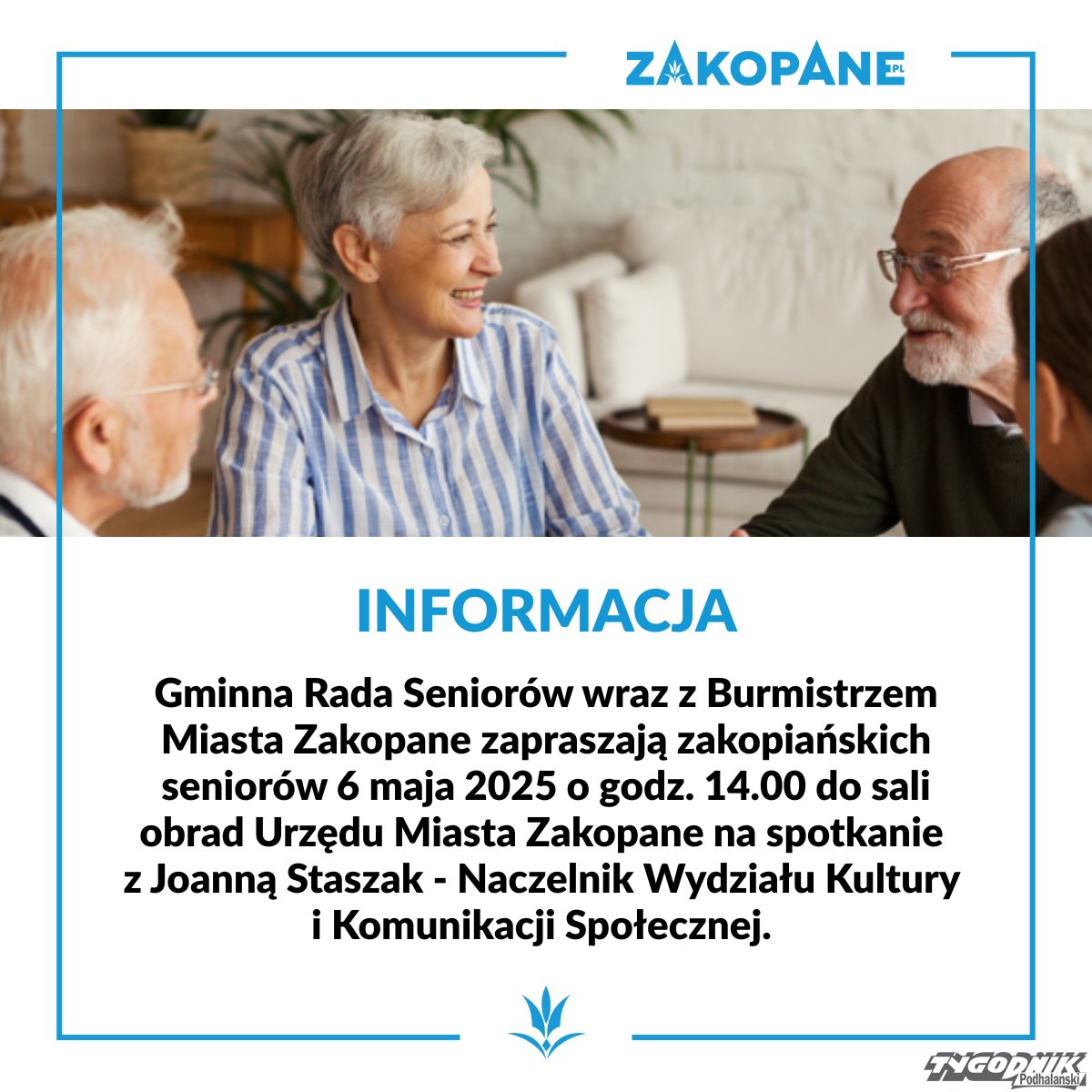 Gminna Rada Seniorów i burmistrz Zakopanego serdecznie zapraszają zakopiańskich seniorów 6 maja (wtorek) o godz. 14.00 do sali obrad UM Zakopane, ul. Kościuszki 13 na spotkanie z Joanną Staszak - naczelnik Wydziału Kultury i Komunikacji Społecznej.