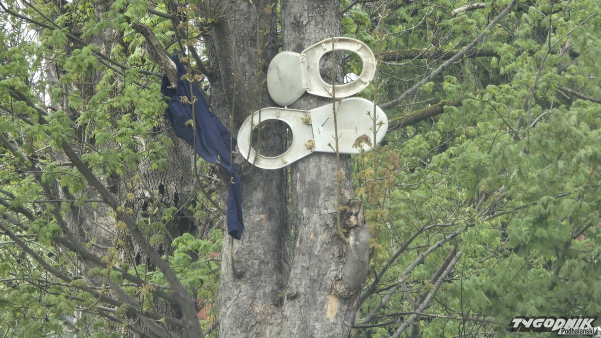 Dwa lata temu pisaliśmy o sąsiedzkim konflikcie w tym miejscu. Był tam m. in. niszczony płot, pojawiały się napisy farbą. Teraz na drzewach pojawiła się "instalacja" złożona z desek klozetowych. Wcześniej miały one zostać zdjęte, ale pojawiły się ponownie.