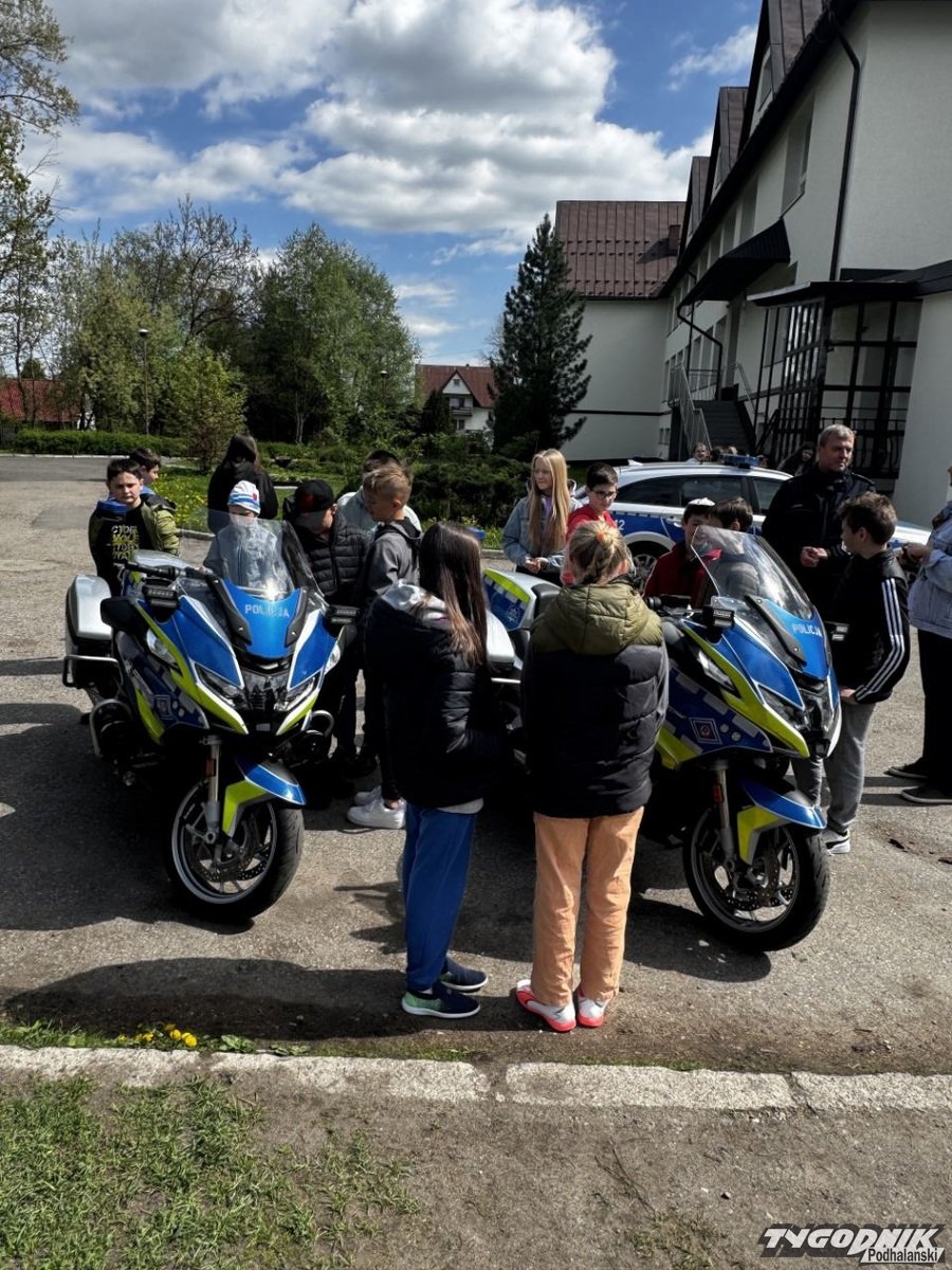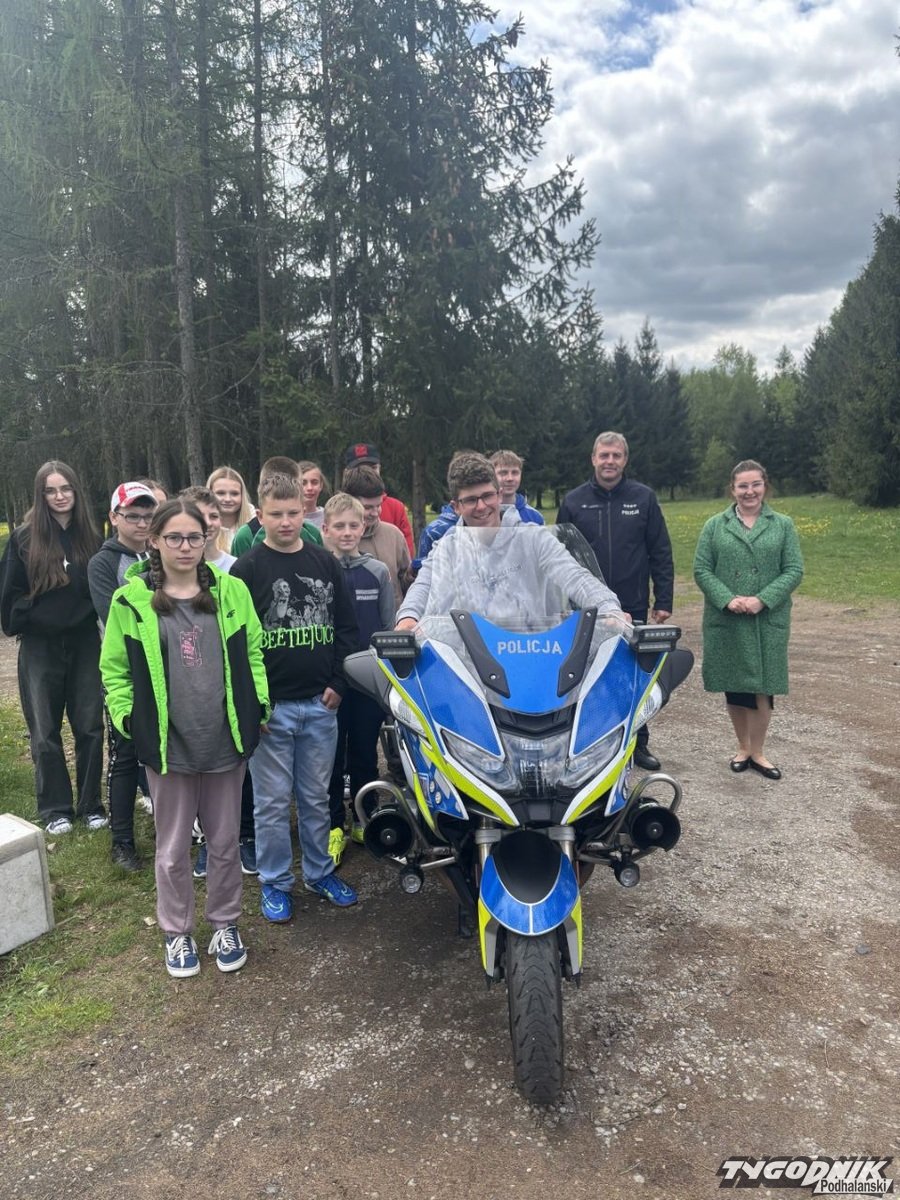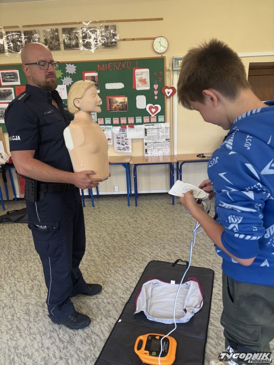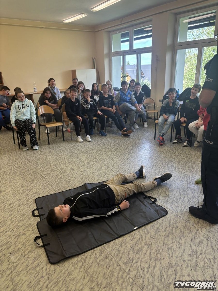 Mundurowi przeprowadzili lekcję, nauczali jak nieść pierwszą pomoc i bezpiecznie zachowywać się na drodze.