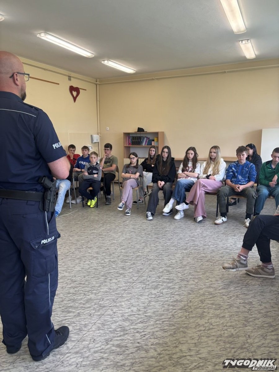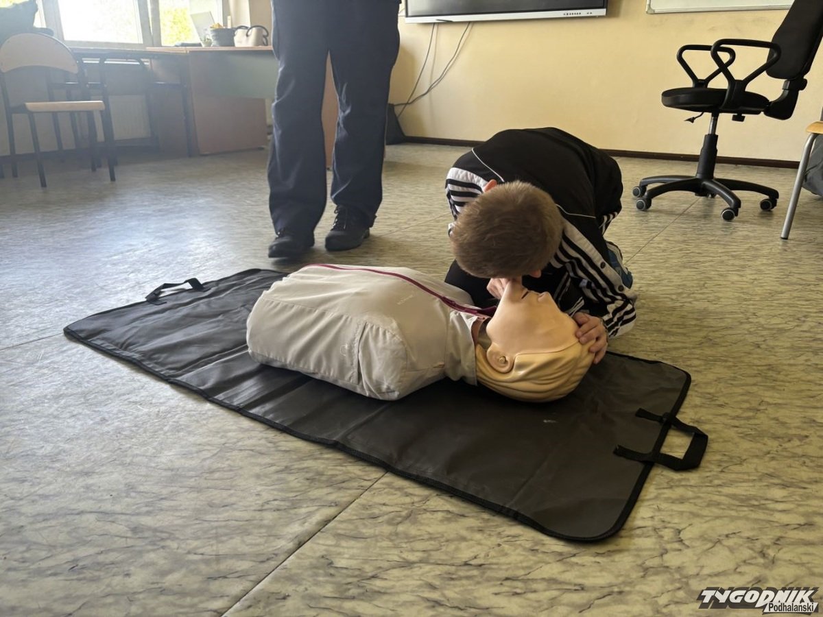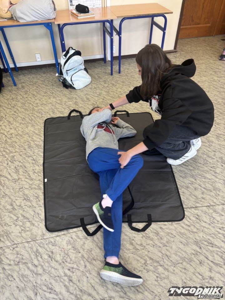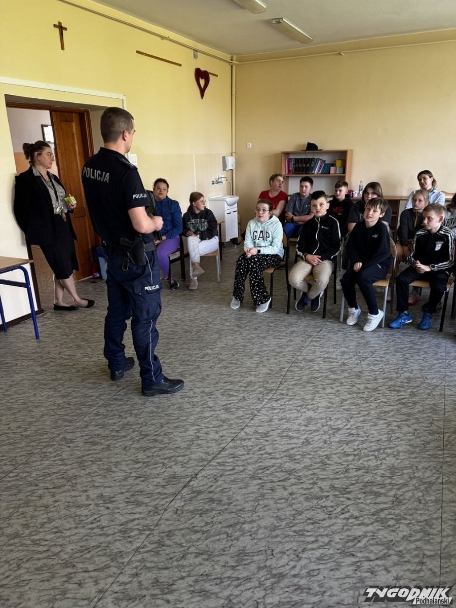 Mundurowi przeprowadzili lekcję, nauczali jak nieść pierwszą pomoc i bezpiecznie zachowywać się na drodze.