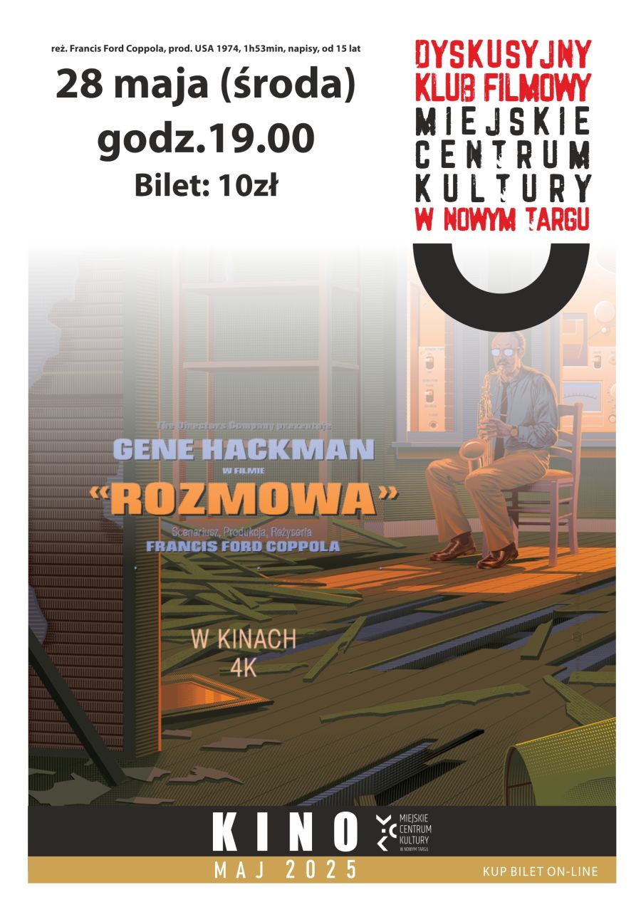 Na seans w ramach DKF Miejskie Centrum Kultury w Nowym Targu zaprasza w środę 28.05. Obejrzymy kultowy film Francisa Forda Coppoli "Rozmowa" z 1974 roku.