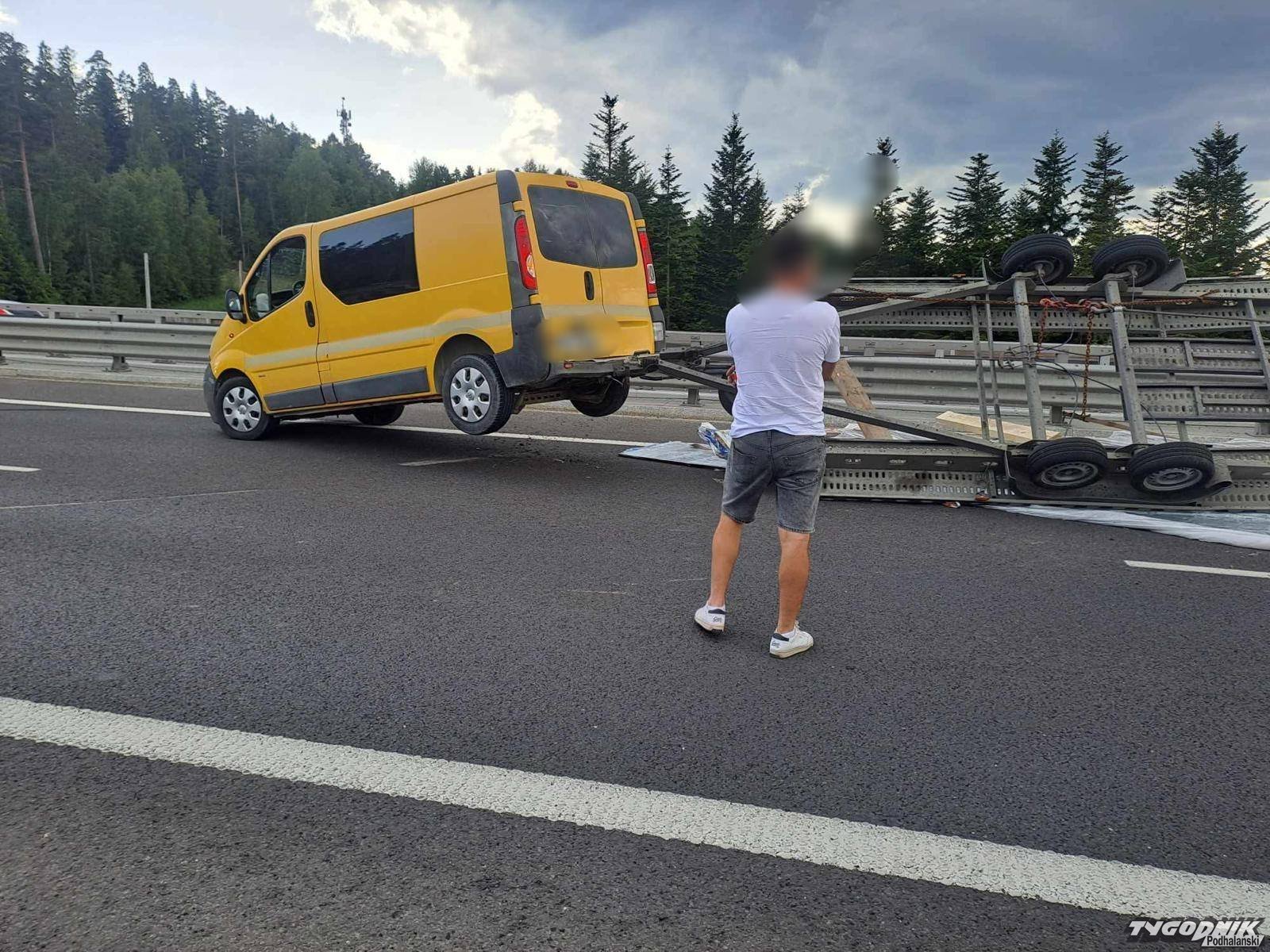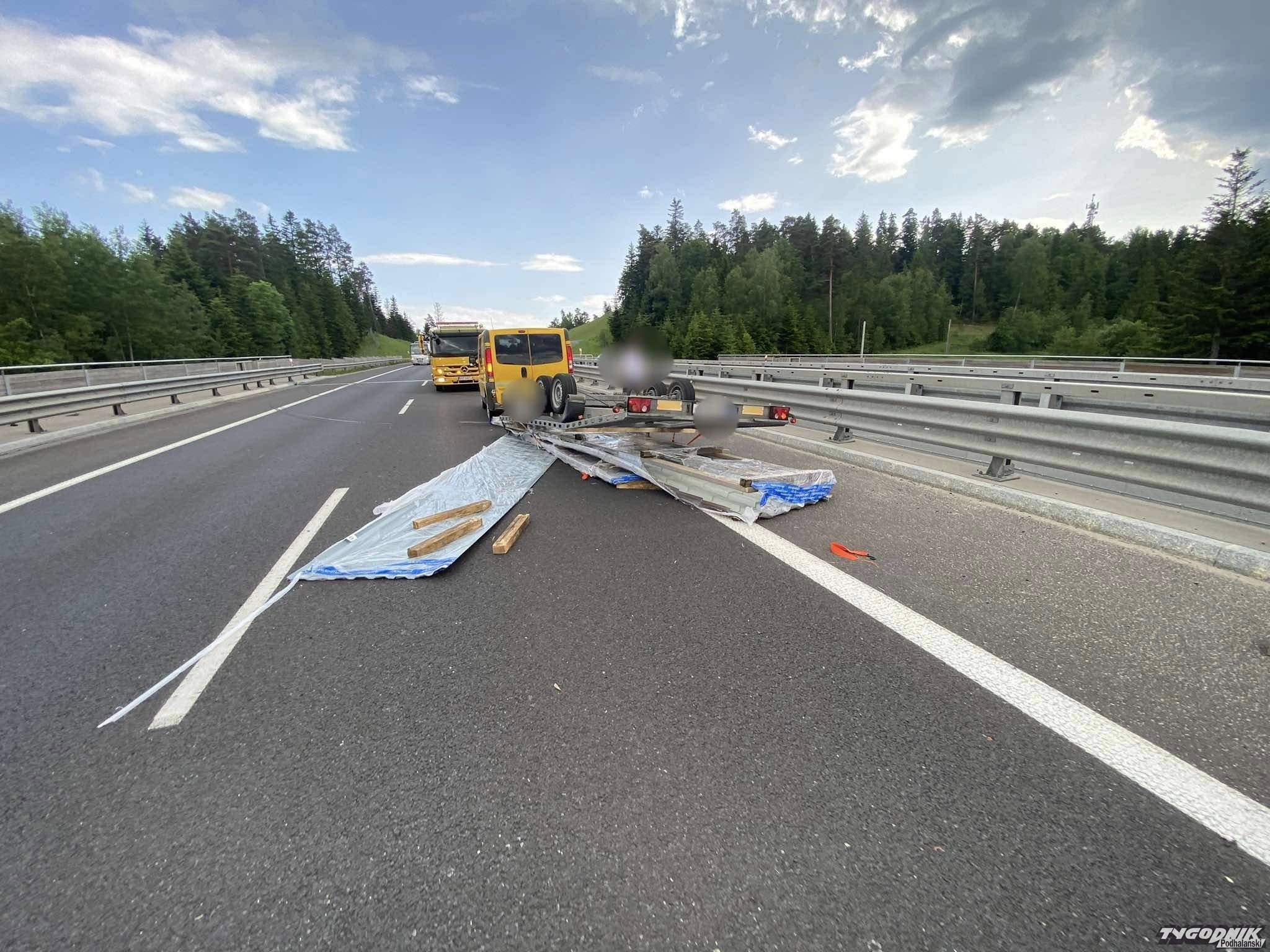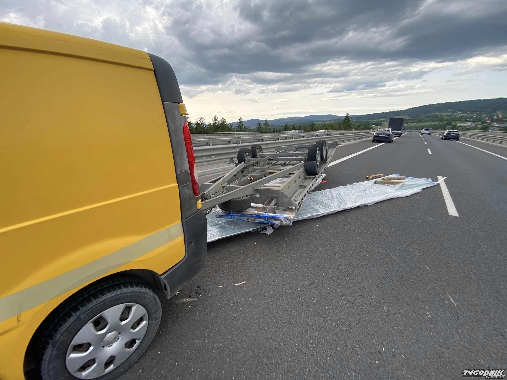 Do zdarzenia doszło na estakadzie w Skomielnej Białej, na pasie w Kierunku Krakowa. Samochód dostawczy ciągnął przyczepę, na której była przewożona blacha dachowa. Miejsce zdarzenia zabezpieczyli strażacy. Pomoc drogowa już przygotowuje uszkodzony zestaw do odholowania.